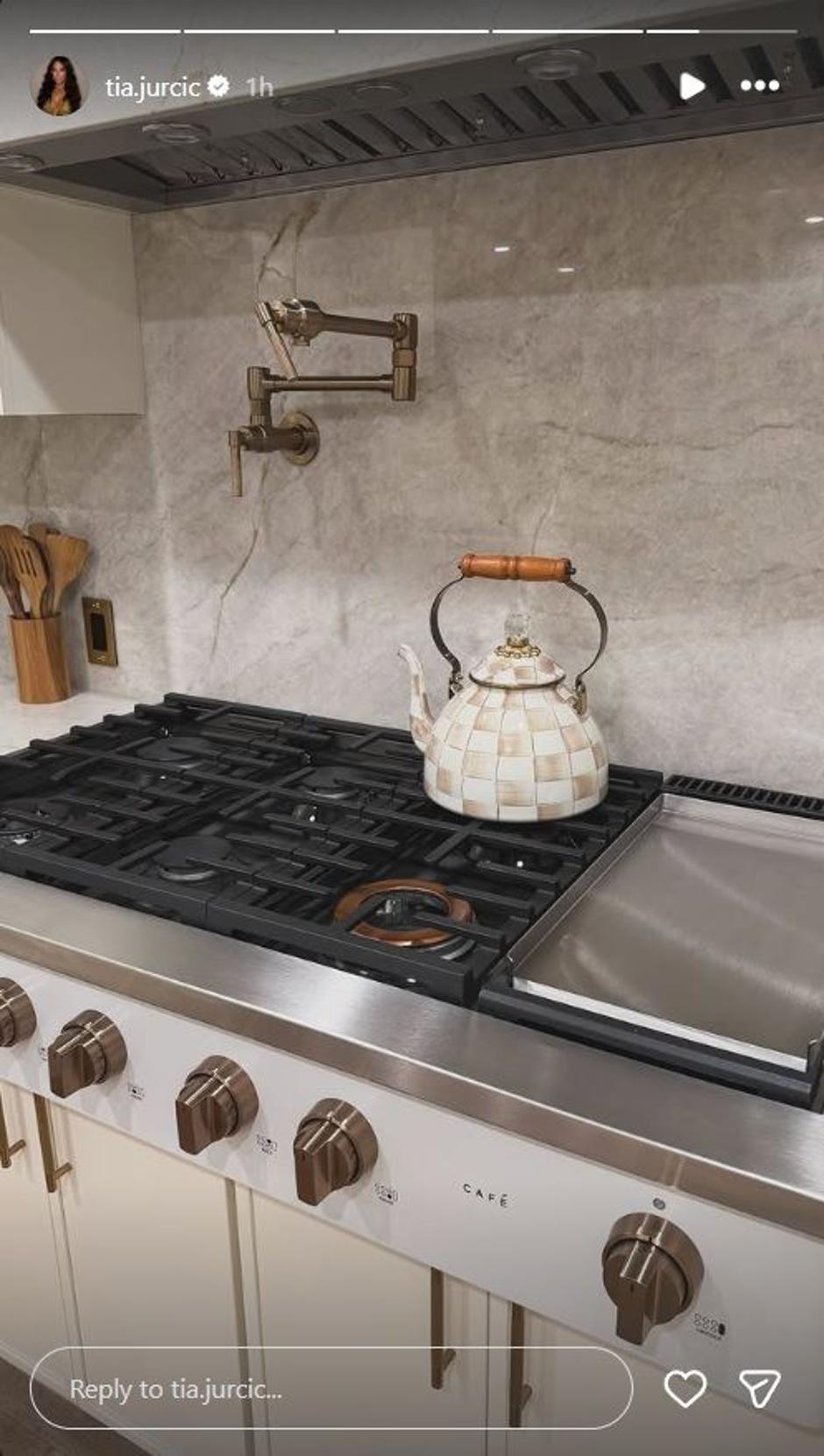 Središte njezina doma je prostrana kuhinja koja odražava stil modernog američkog luksuza. Dominira ogroman profesionalni štednjak, kakav se viđa u vrhunskim restoranima, a iznad njega je masivna industrijska napa. Zid iza štednjaka obložen je elegantnim kamenom, što prostoru daje profinjen izgled, dok kombinacija bijelih ormarića i zlatnih detalja zaokružuje dojam raskoši.