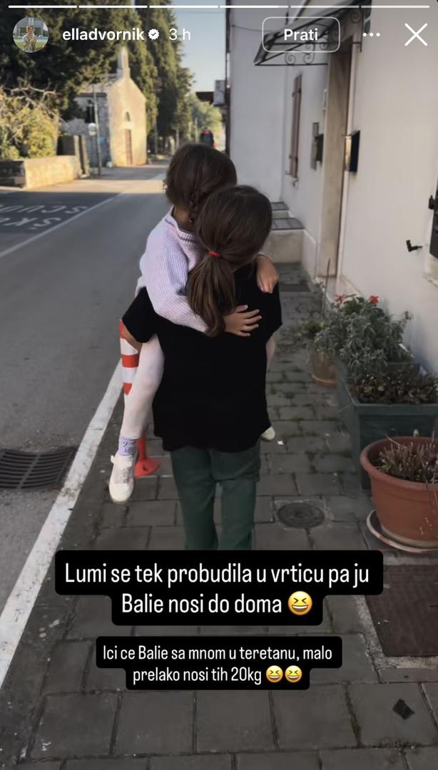 Influencerica Ella Dvornik redovito dijeli detalje svoje svakodnevice na društvenim mrežama. Sada je ponovno podijelila jedan obiteljski trenutak, ali i veliki razlog za slavlje, Naime, Ella je u utorak poslijepodne objavila fotografiju kako starija kći Balie Dee nosi svoju mlađu sestru Lumi Wren. “Lumi se tek probudila u vrtiću pa ju Balie nosi do doma. Ići će Balie sa mnom u teretanu, malo prelako nosi tih 20 kilograma”, napisala je te dodala da će Balie u srijedu navršiti osam godina. " Ako ste tu otkad se rodila, onda ste bar osam godina tu... Osam godina!!!!” napisala je Ella.