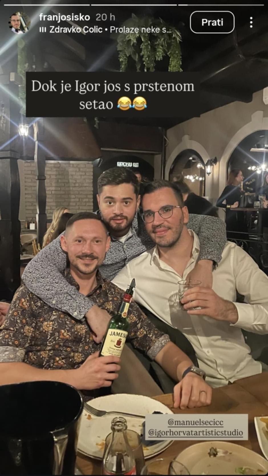 Naime, Šiško je u pričama na svojem Instagram profilu podijelio dvije zajedničke fotografije s Igorom i Manuelom, jednu kao običan selfi, a na drugoj se našalio na Igorov račun. - Dok je Igor još s prstenom šetao - napisao je uz fotografiju trojca iz jednog restorana.