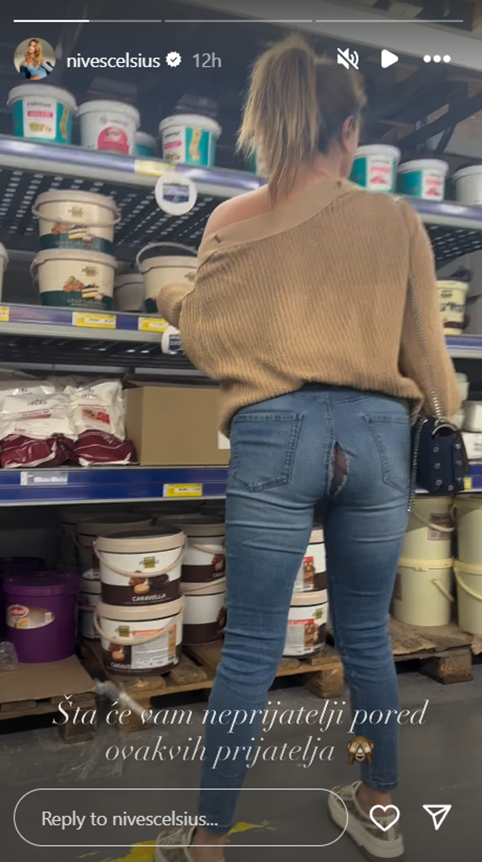 Pjevačica, glumica, spisateljica i influencerica Nives Celzijus na Instagramu je objavila novi video u kojem je otkrila da je doživjela malu nezgodu dok je bila u kupnji. Naime, Nives je podijelila video na kojem se vidi da su joj pukle hlače, a sve je snimio njen prijatelj. Rekla je kako nije bila svjesna da su joj hlače pukle točno posred stražnjice, a da joj prijatelj to nije htio reći.
