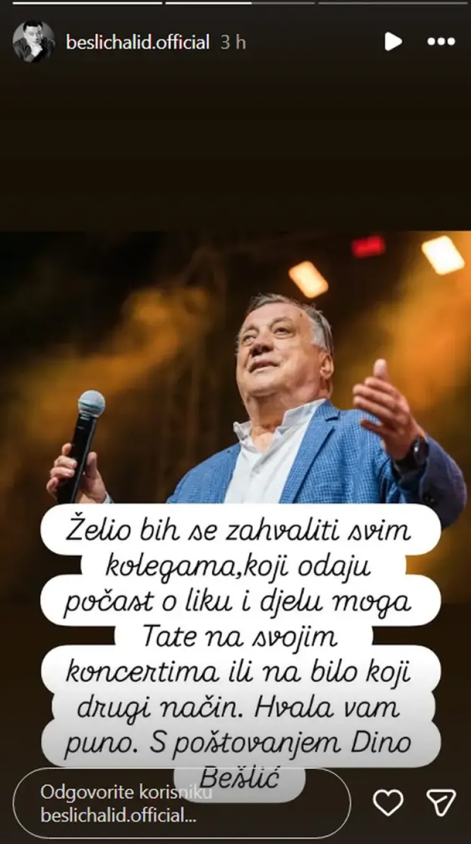 Dva mjeseca nakon smrti legendarnog pjevača sevdaha i narodne muzike, Halida Bešlića, čiji je gubitak teško podnijela cijela regija, jasno je da će njegovo ime zauvijek biti izgovarano s poštovanjem. Brojni obožavatelji i kolege prisjećaju ga se kroz njegove pjesme, priče i nastupe. Posebnu pažnju ovih dana privukla je poruka njegova sina, Dine Bešlića, koji se oglasio na društvenim mrežama. Na Instagram profilu svog pokojnog oca objavio je dirljivu zahvalu: "Želio bih zahvaliti svim kolegama koji odaju počast liku i djelu moga tate na svojim koncertima ili na bilo koji drugi način. Hvala vam puno. S poštovanjem, Dino Bešlić."