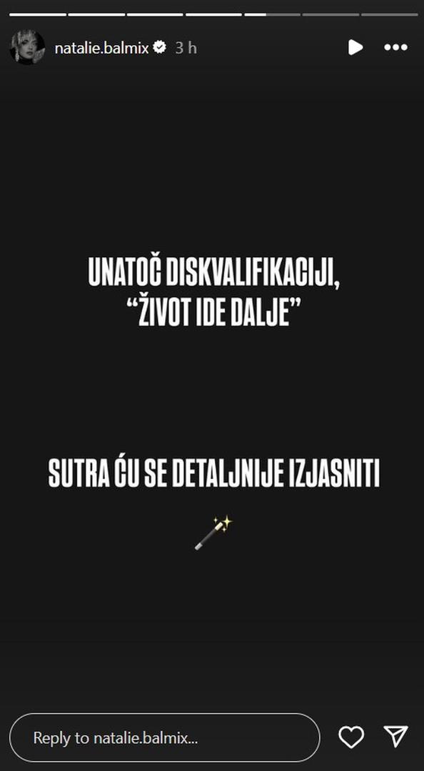 Natalie Balmix odlučila se oglasiti povodom diskvalifikacije putem društvenih mreža. Na svom Instagram profilu kratko je poručila: "Unatoč diskvalifikaciji, 'život ide dalje'. Sutra ću se detaljnije izjasniti."