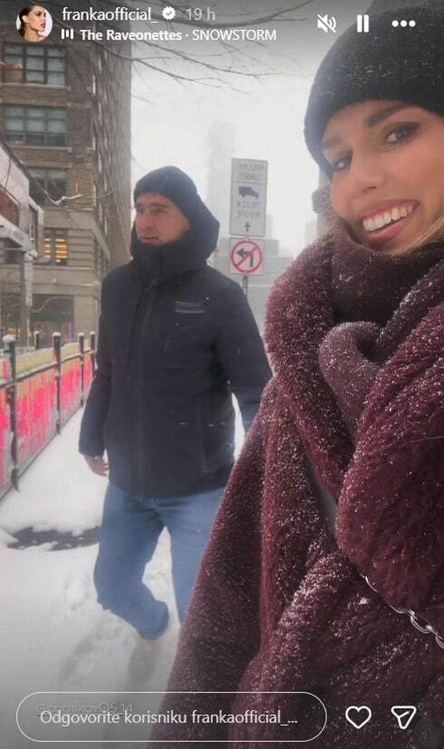 Jedan od najuzbudljivijih gradova na svijetu pogodila je snježna oluja, a prizori bijelih ulica i automobila zatrpanih snijegom brzo su se našli na Frankinom profilu. Iako romantičan i fotogeničan, snijeg joj je odmah zadao i male probleme. Franka se, naime, kroz šalu požalila kako nije ponijela adekvatnu obuću za takve vremenske uvjete, pa joj je šetnja snježnim ulicama Manhattana bila nešto izazovnija nego što je planirala. Unatoč hladnoći, dobro raspoloženje nije izostalo, a Franka je s osmijehom dijelila trenutke iz grada koji nikad ne spava, čak ni pod snježnim pokrivačem.