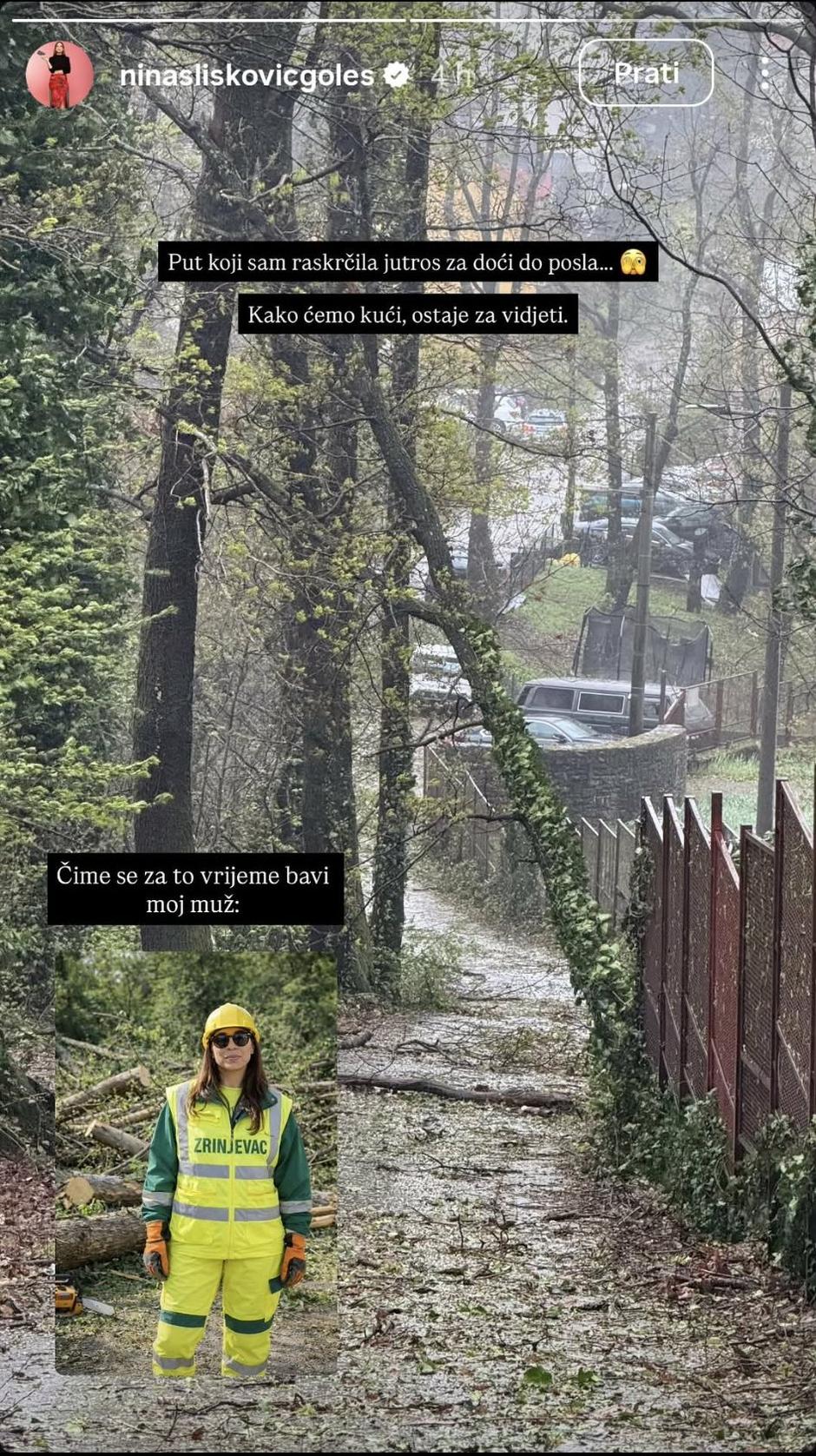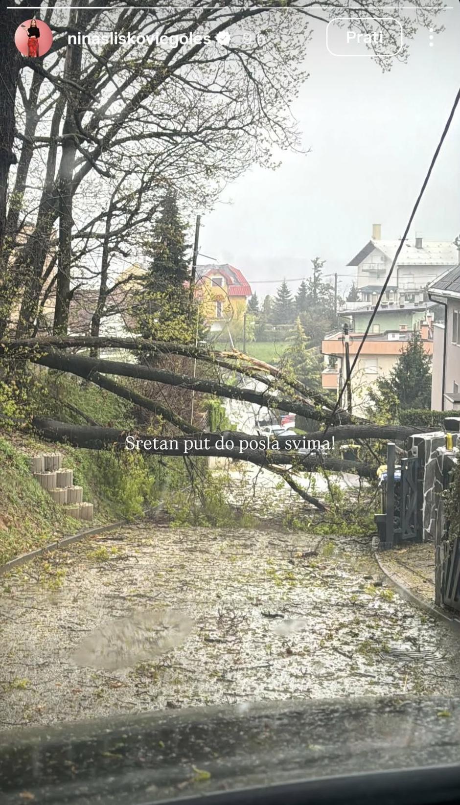 Umjesto uobičajenog jutarnjeg ritma i priprema za emisiju, voditeljicu radija bravo! Ninu Slišković Goleš na putu do posla dočekala je prepreka koju nije mogla ignorirati. Svoju je malu jutarnju avanturu zabilježila kamerom i podijelila s brojnim pratiteljima na Instagramu, a prizor je uistinu bio dramatičan. Na snimci se vidi srušeno stablo koje joj je u potpunosti zapriječilo prolaz, kao izravna posljedica kaosa kojeg je snažno nevrijeme ostavilo iza sebe na zagrebačkim prometnicama. Njezin dolazak na posao tako je bio značajno otežan, a uz fotografiju je napisala: "Sretan put do posla svima."
