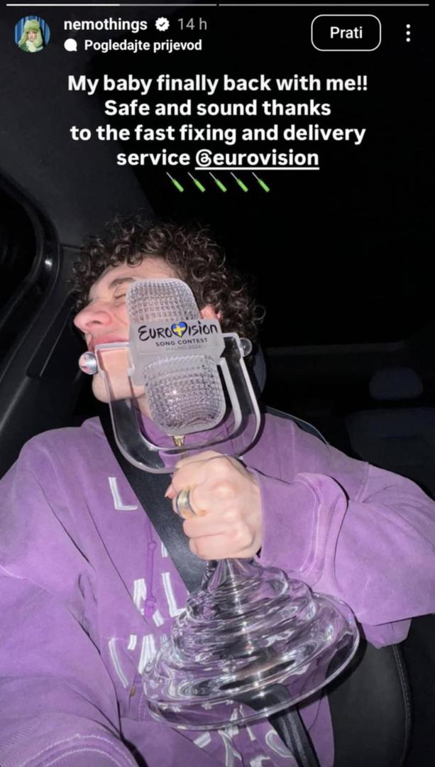 Švicarski predstavnik Nemo, koji je trijumfirao na prošlogodišnjem Eurosongu s pjesmom "The Code", ne krije oduševljenje zbog ponovnog susreta sa svojim priznanjem. Na Instagram profilu objavio je fotografiju na kojoj s velikim osmijehom pozira držeći slavni stakleni mikrofon. - Moja beba je konačno opet sa mnom! Na sigurnom je zahvaljujući brzom popravljanju i dostavi organizatora Eurovizije - napisao je Nemo u Instagram storyju, potvrđujući da je trofej sada ponovno u jednom komadu. Ovaj trenutak označava kraj male drame koja je započela odmah nakon proglašenja pobjednika.