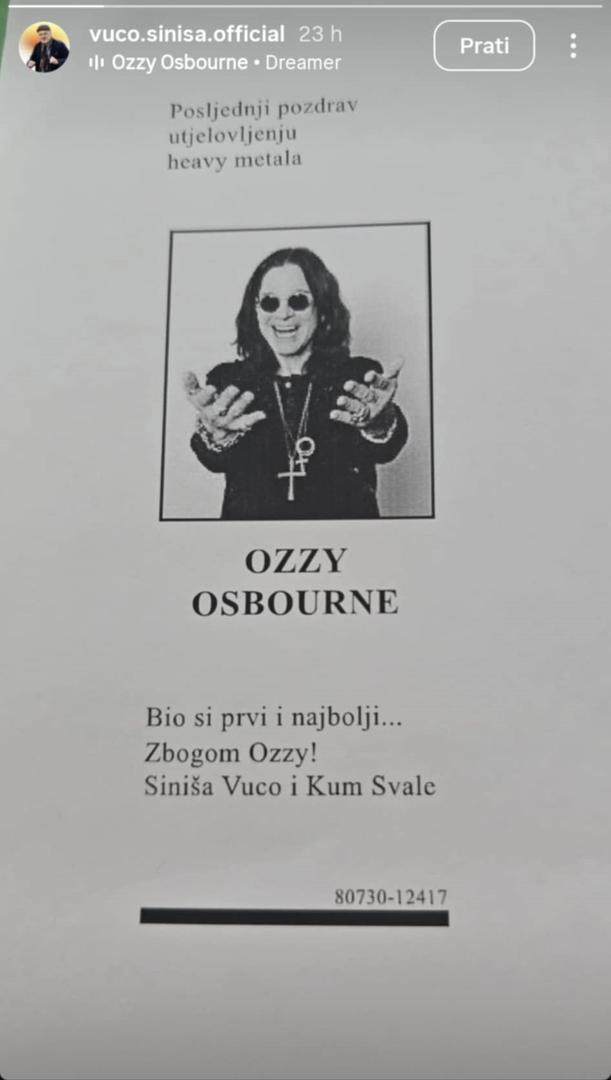 Siniša Vuco, koji je i sam na početku karijere svirao heavy metal, odao je počast jednom od svojih najvećih uzora, nedavno preminulom Ozzyju Osbourneu, na uistinu nesvakidašnji način. Na svom je Instagram profilu objavio fotografiju osmrtnice koju je uplatio u Slobodnoj Dalmaciji za legendarnog frontmena Black Sabbatha. - Posljednji pozdrav utjelovljenju heavy metala. Bio si prvi i najbolji… Zbogom Ozzy! - stoji u emotivnoj poruci koju potpisuju Siniša Vuco i njegov kum Svale.