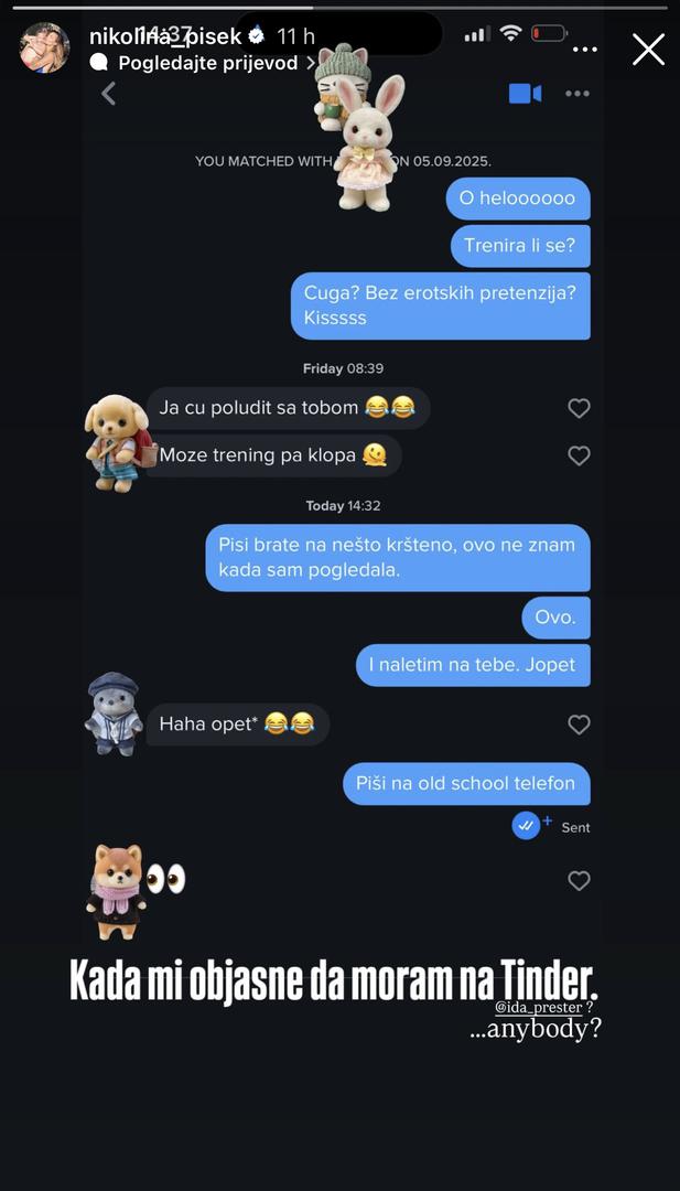RTL-ova voditeljica, 52-godišnja Nikolina Pišek na društvenoj mreži Instagram često objavljuje detalje i neke zanimljive dogodovštine iz privatnog života. Tako je sada objavila zanimljivost s aplikacije za upoznavanje Tinder. Naime, ondje je objavila zanimljivost s te društvene mreže za "dejtanje" te je napisala: "Kada mi objasne da moram na Tinder", a komunikacija s misterioznim muškarcem išla je ovako... Nikolina mu je poslala: "O Hellou. Trenira li se? Cuga, bez erotskih pretenzija? Kiss", a muškarac joj je potom odgovorio: "Ja ću poludjeti s tobom, može trening pa klopa", a ona mu je potom dodala: "Piši brate na nešto kršteno, ovo ne znam kada sam pogledala. I naletim na tebe, opet. Piši na 'old school' telefon", dodala je.