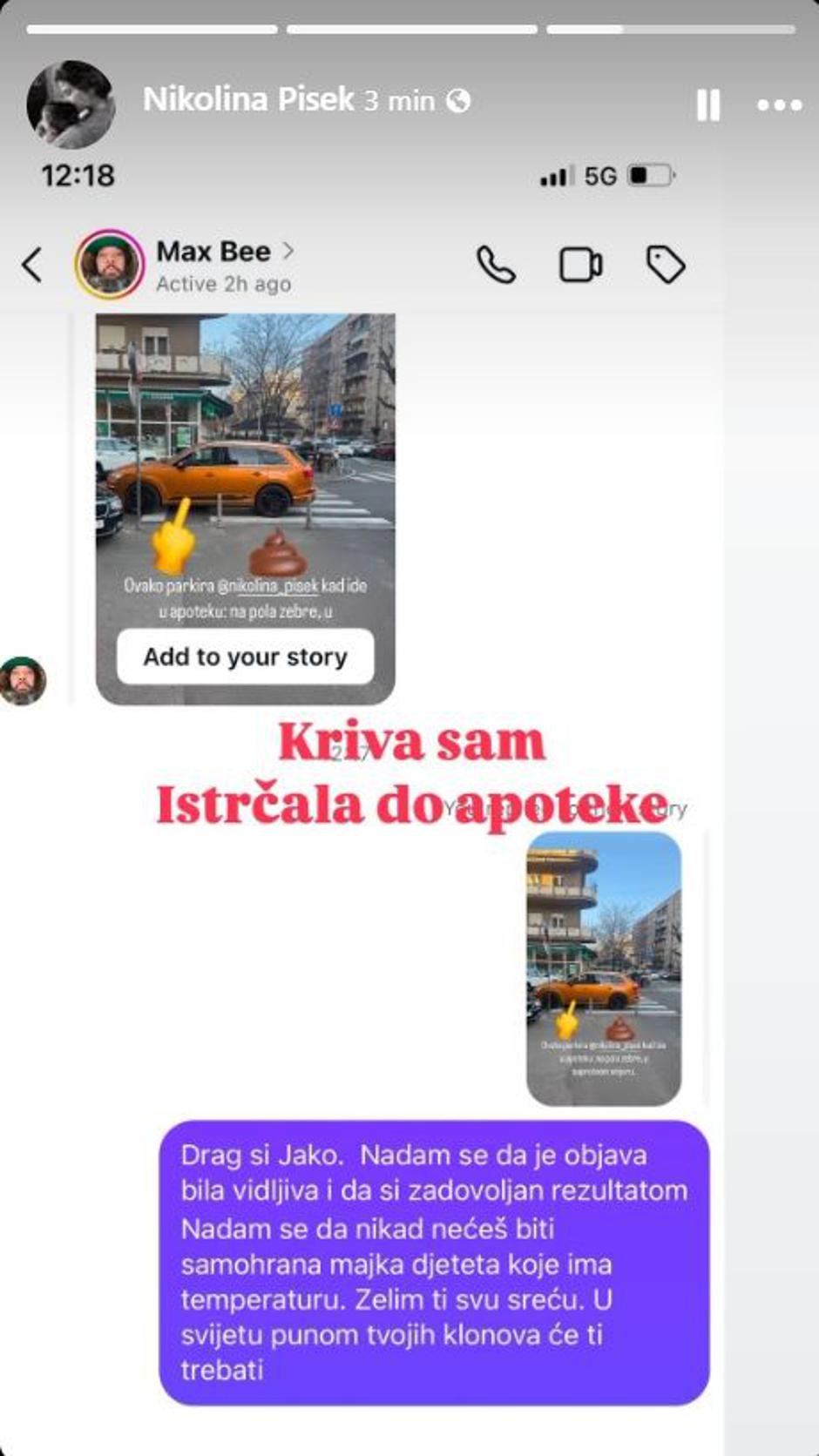 Poznata voditeljica Nikolina Pišek našla se na meti kritika nakon što je jedan korisnik Instagrama objavio fotografiju njezina automobila Audi, parkiranog na pola pješačkog prijelaza i u suprotnom smjeru u centru Zagreba. Uz fotografiju je sarkastično napisao: "Ovako parkira Nikolina Pišek kad ide u ljekarnu." Budući da ju je u objavi označio, Nikolina ju je vidjela te odlučila odgovoriti – prvo njemu, a zatim i svojim pratiteljima.