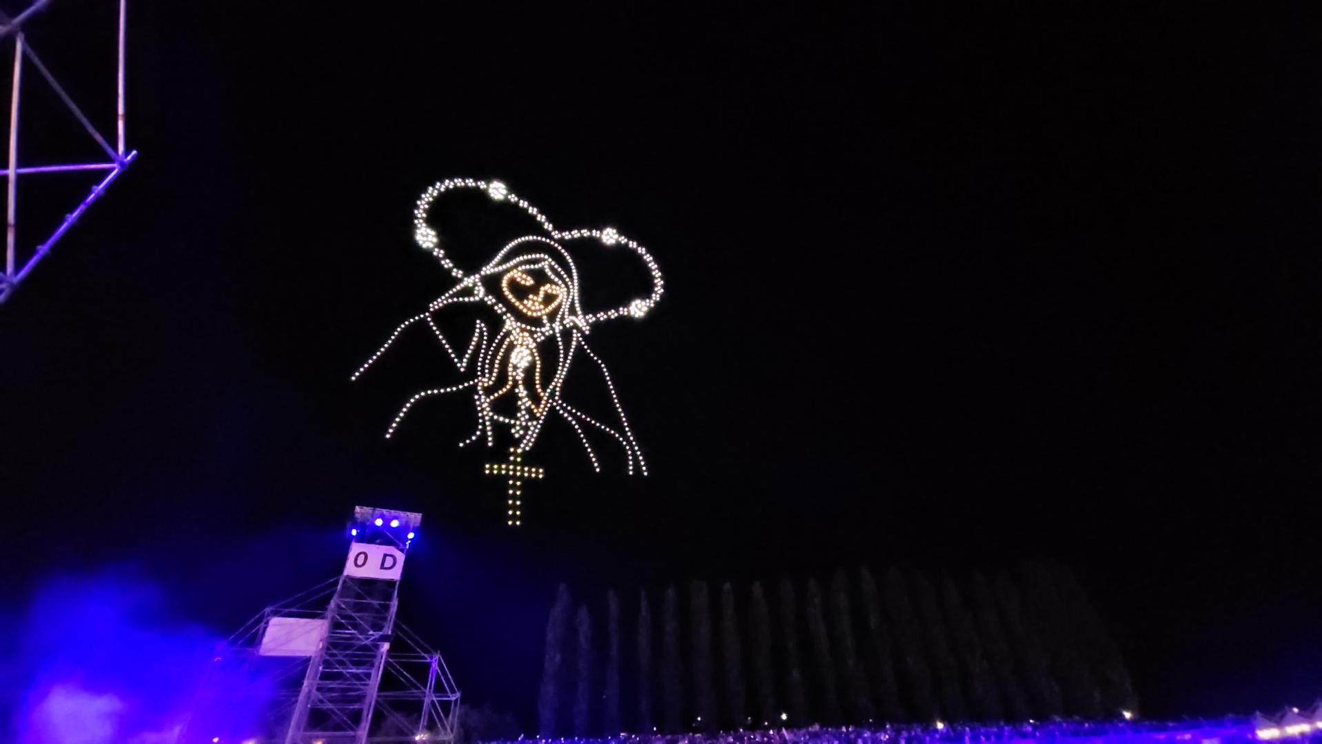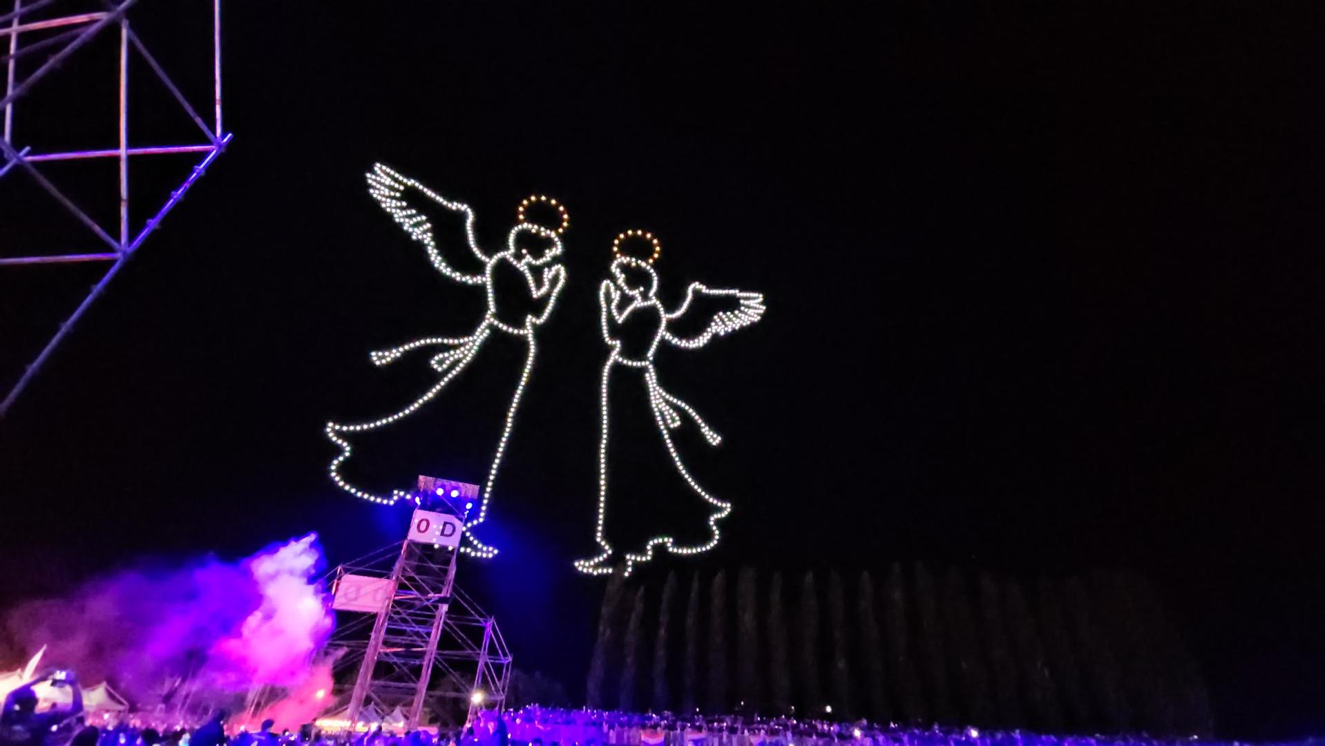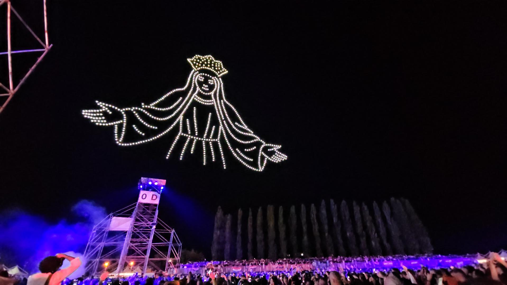 Na nebu iznead sinjskog hipodroma gdje se trenutačno održava koncert na kojem prisustvuje više od 150 tisuća ljudi, pojavili su se dronovi koji su formirali oblike anđela, Djevice Marije i križa.