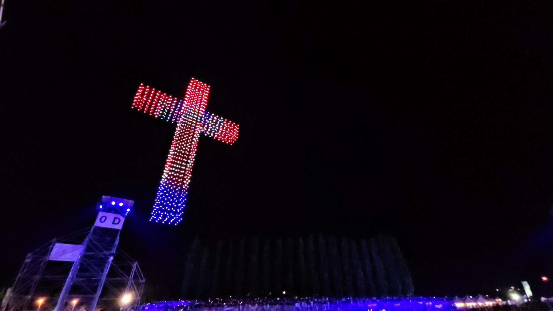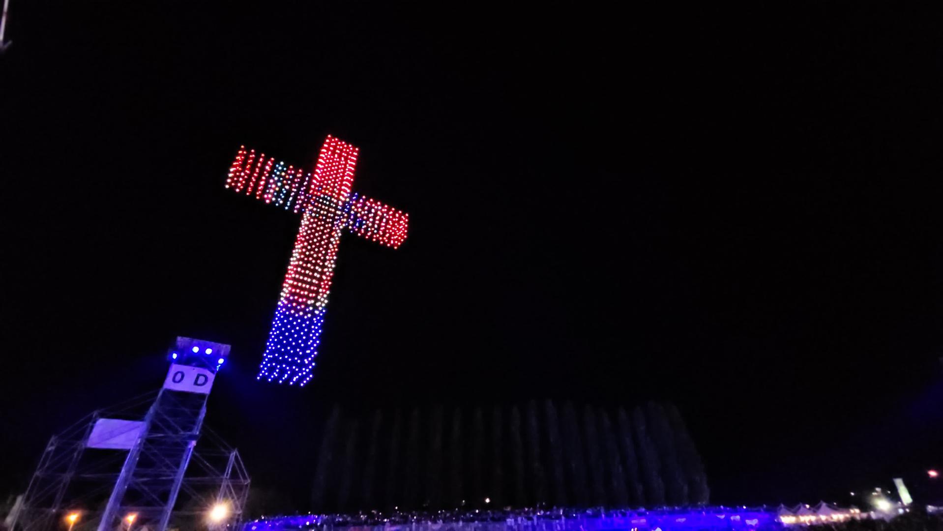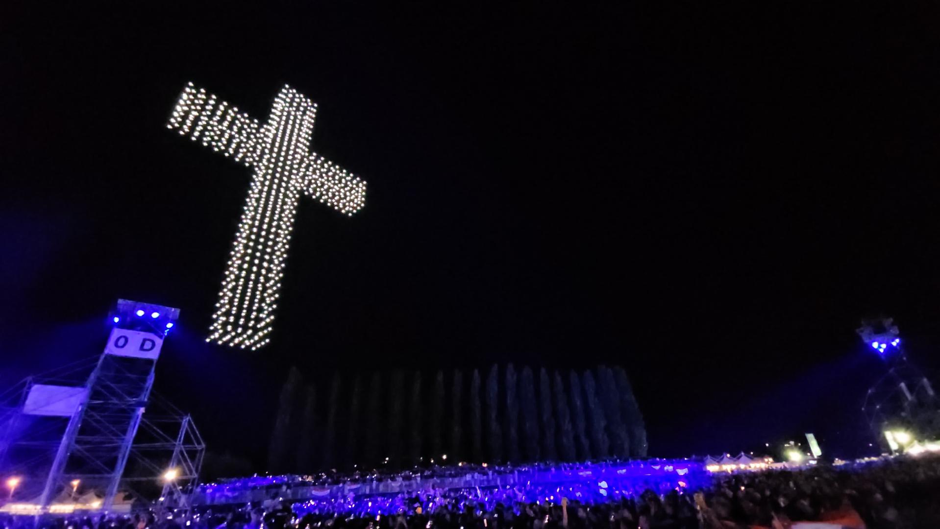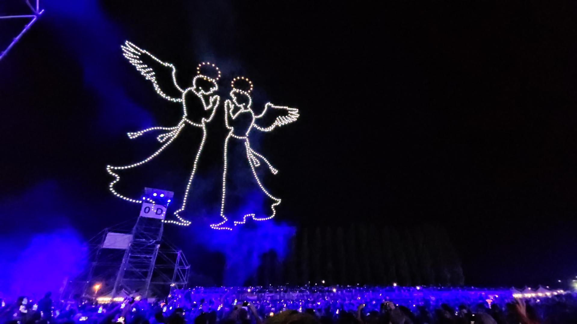 Na nebu iznead sinjskog hipodroma gdje se trenutačno održava koncert na kojem prisustvuje više od 150 tisuća ljudi, pojavili su se dronovi koji su formirali oblike anđela, Djevice Marije i križa.