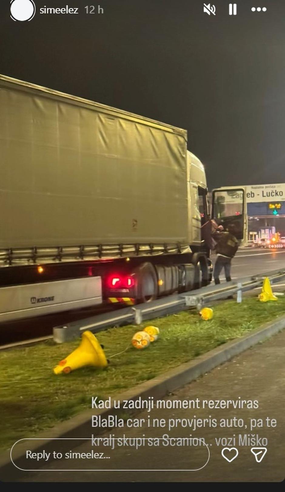 Naša popularna pjevačica Maja Šuput odlučila je uzeti nekoliko dana u veljači te otputovati sa svojim emotivnim partnerom Šimom Elezom u Pariz, a fotografije s putovanja podijelila je na društvenim mrežama. No, Šime je sada otkrio da se vratio s romantičnog putovanja. Odmah nakon povratka doživio je situaciju koju će još dugo prepričavati prijateljima i pratiteljima. Naime, Šime je za povratak odlučio rezervirati prijevoz putem popularne aplikacije BlaBlaCar. No u cijelom procesu napravio je jednu ključnu pogrešku – nije provjerio o kakvom je vozilu riječ. Kada je stigao na dogovoreno mjesto susreta, umjesto klasičnog osobnog automobila dočekalo ga je – teretno vozilo. Simpatičnu situaciju odmah je podijelio na svom profilu na Instagramu. Na fotografiji se vidi kako se, uz osmijeh, penje u veliki kamion parkiran pokraj ulaza na autocestu, dok je vani već pao mrak. Uz objavu je duhovito napisao: "Kad u zadnji trenutak rezerviraš BlaBla car, ne provjeriš auto, pa te kralj skupi sa Scaniom.... Vozi Miško."