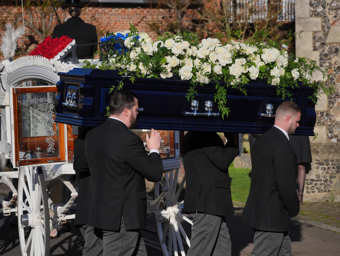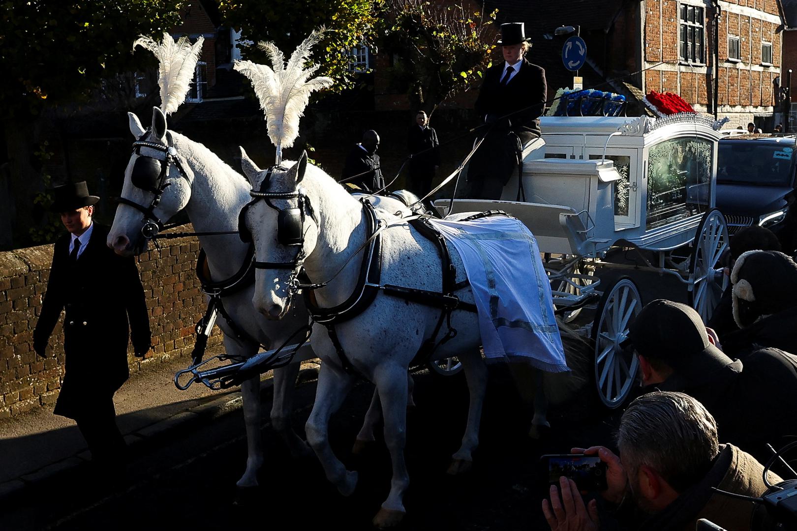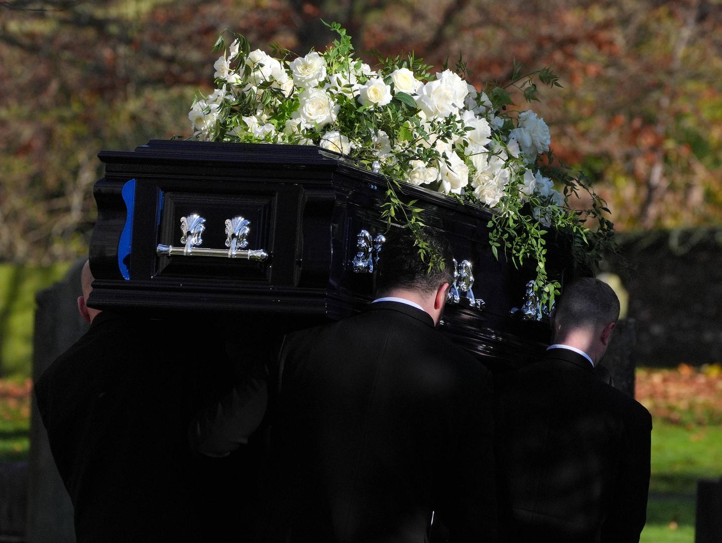 Liamov lijes, prekriven bijelim ružama, dovezen je u bijeloj kočiji koju su vukli konji. Na lijesu su se isticali cvjetni aranžmani s natpisima "sin" i "tata".
