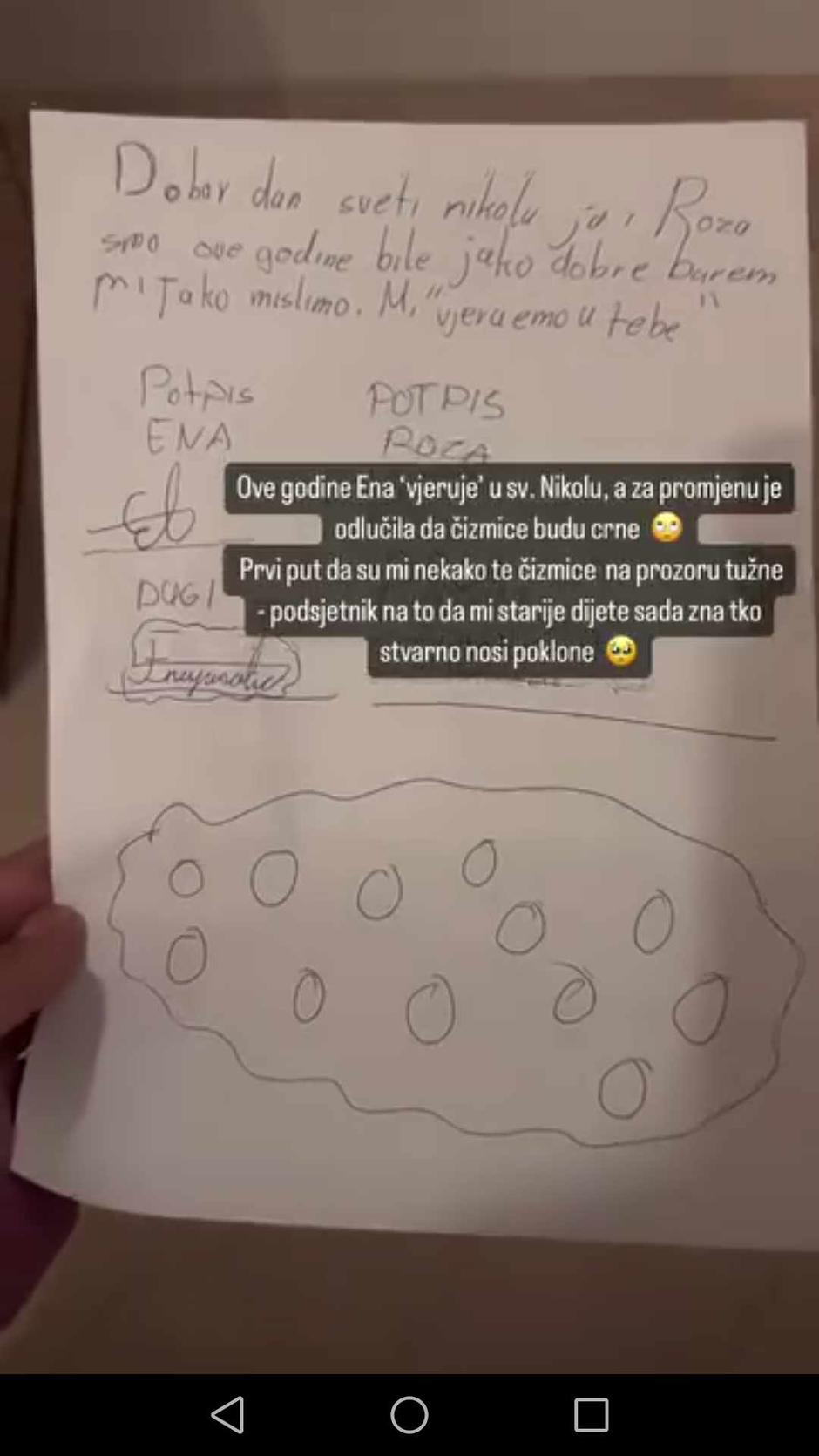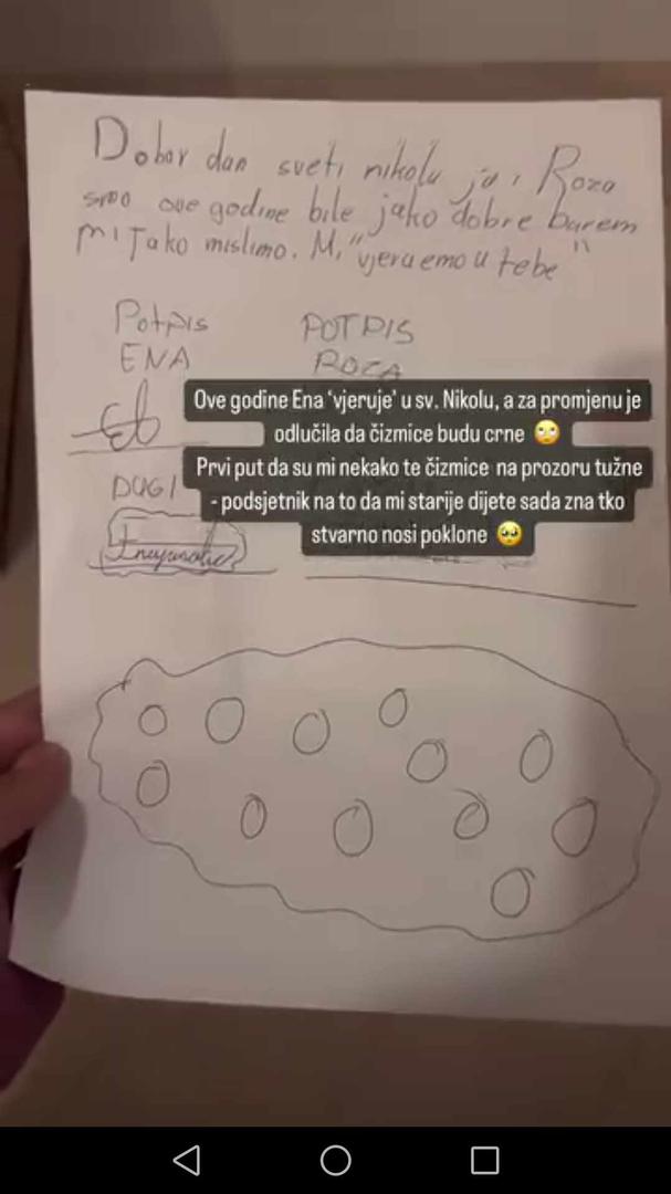 - Dobar dan Sveti Nikola, ja i Roza smo ove godine bile jako dobre, barem mi tako mislimo. Mi "vjerujemo u tebe" - napisale su djevojčice na papiru, a Marijana je to odlučila podijeliti sa svojim pratiteljima i dati svoj komentar. - Ove godine Ena ‘vjeruje’ u Svetog Nikolu, a za promjenu je odlučila da čizmice budu crne. Prvi put da su mi nekako te čizmice na prozoru tužne - podsjetnik na to da mi starije dijete sada zna tko stvarno nosi poklone - osvrnula se voditeljica na sazrijevanje svojih mezimica.
