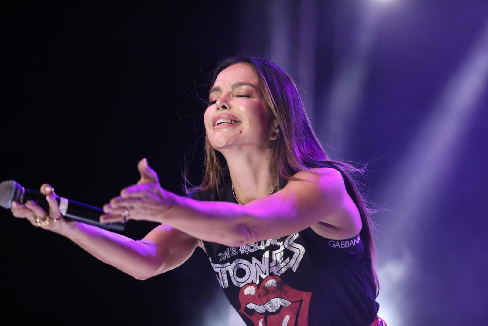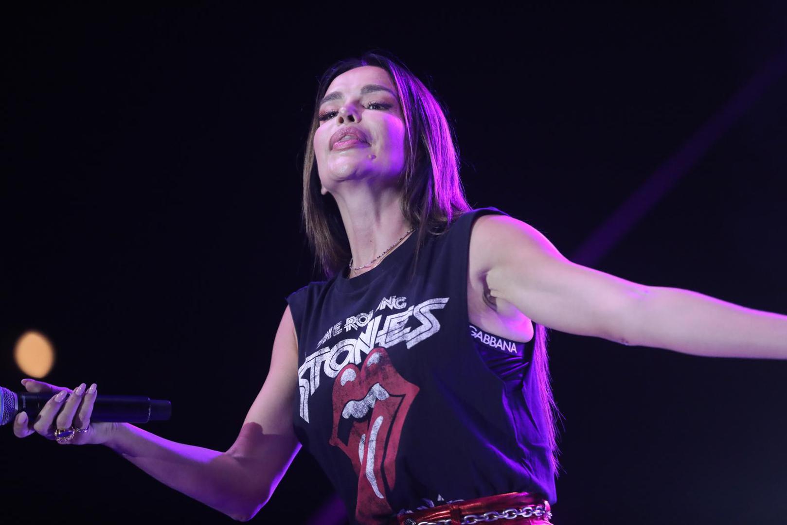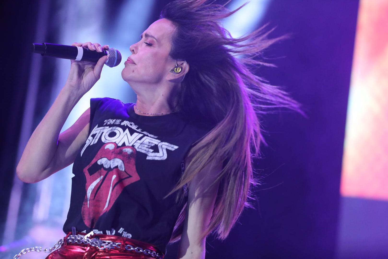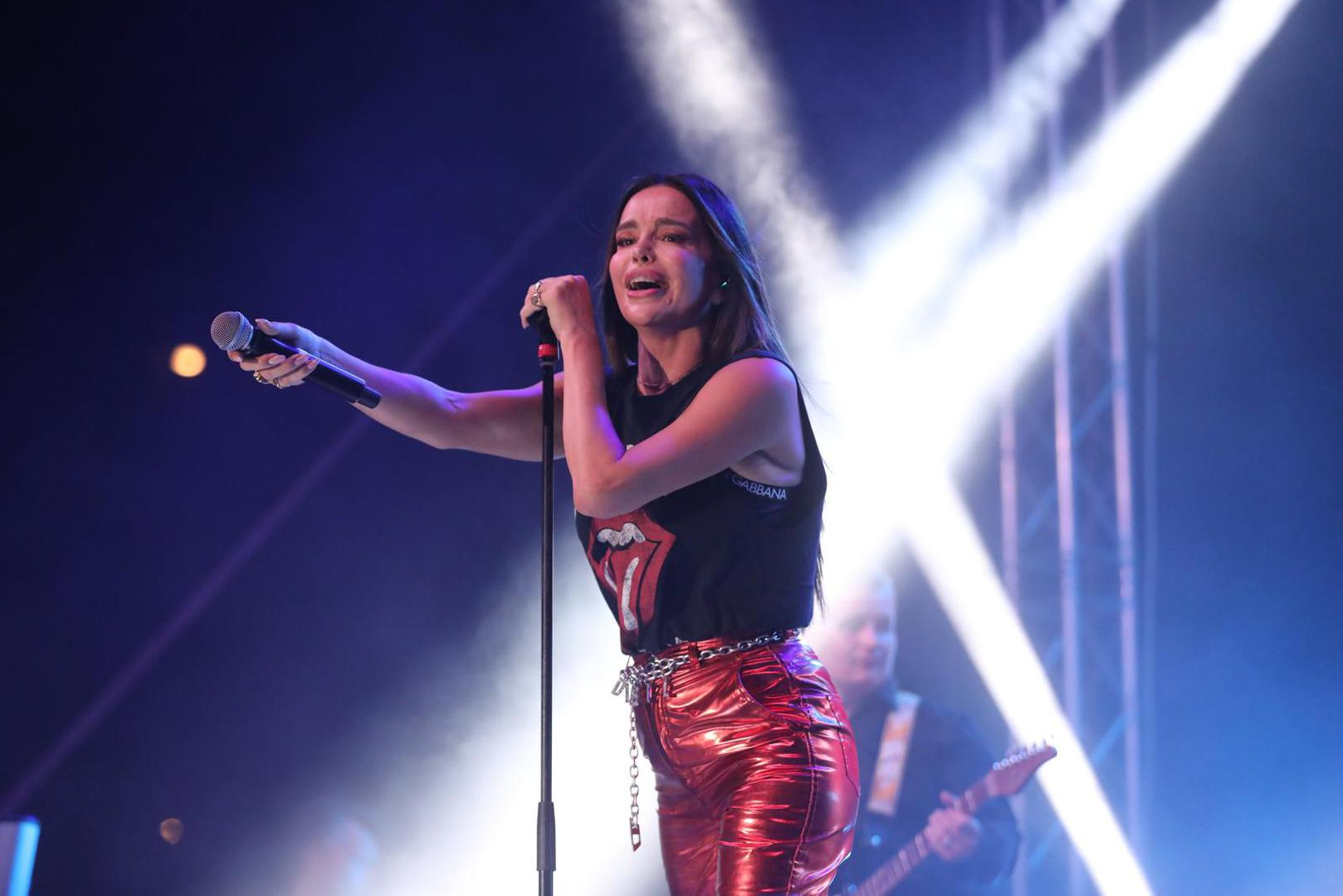 Pjevačica se na pozornici pojavila u rokerskoj modnoj kombinaciji kojom je oduševila. Radilo se o crnoj majici i kožnim, crvenim hlačama preko kojih je nosila remen u obliku lanca, a kosu je raspustila.