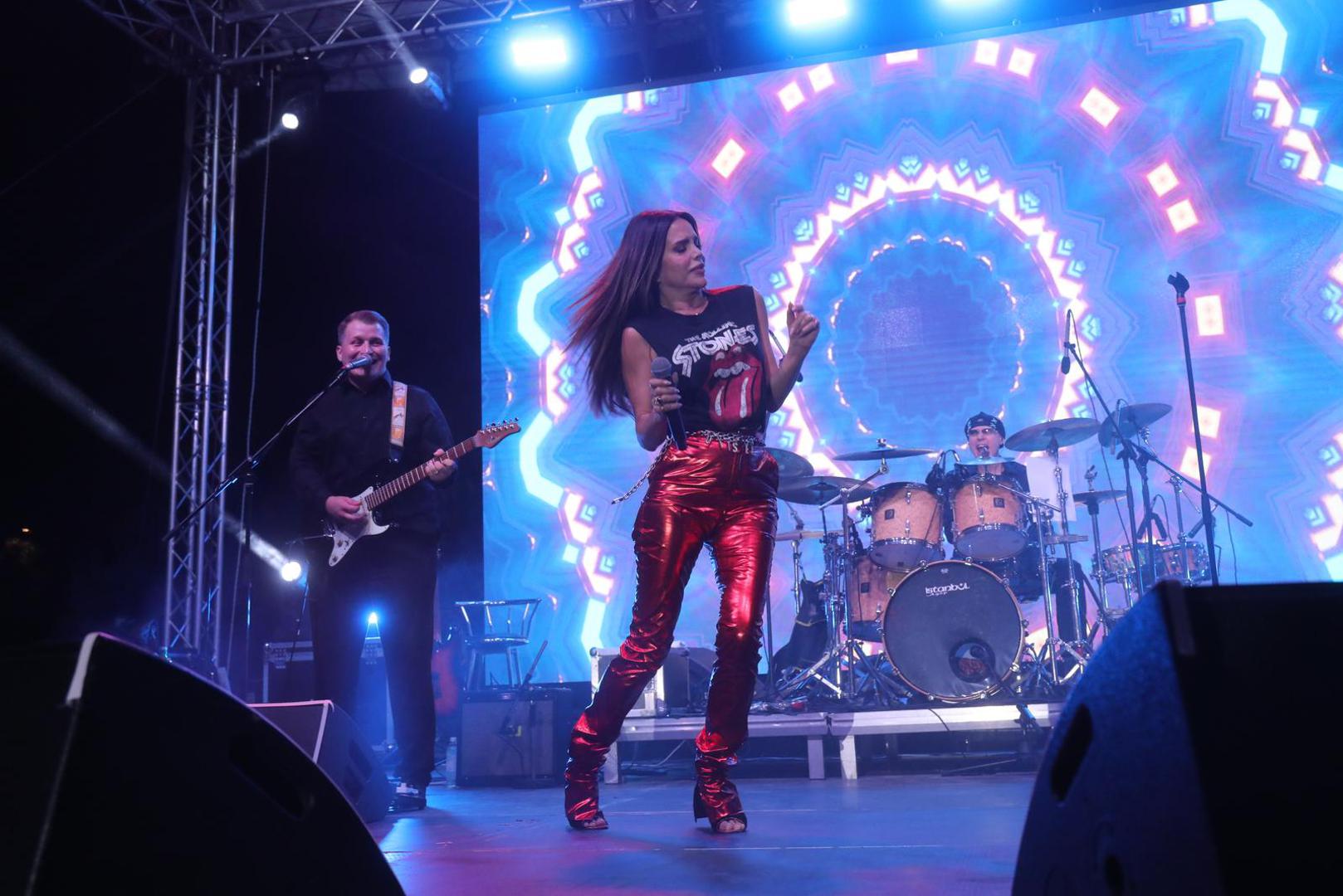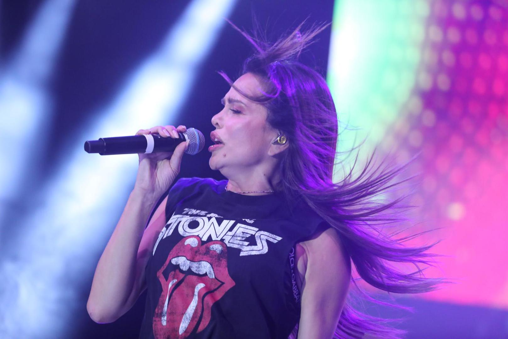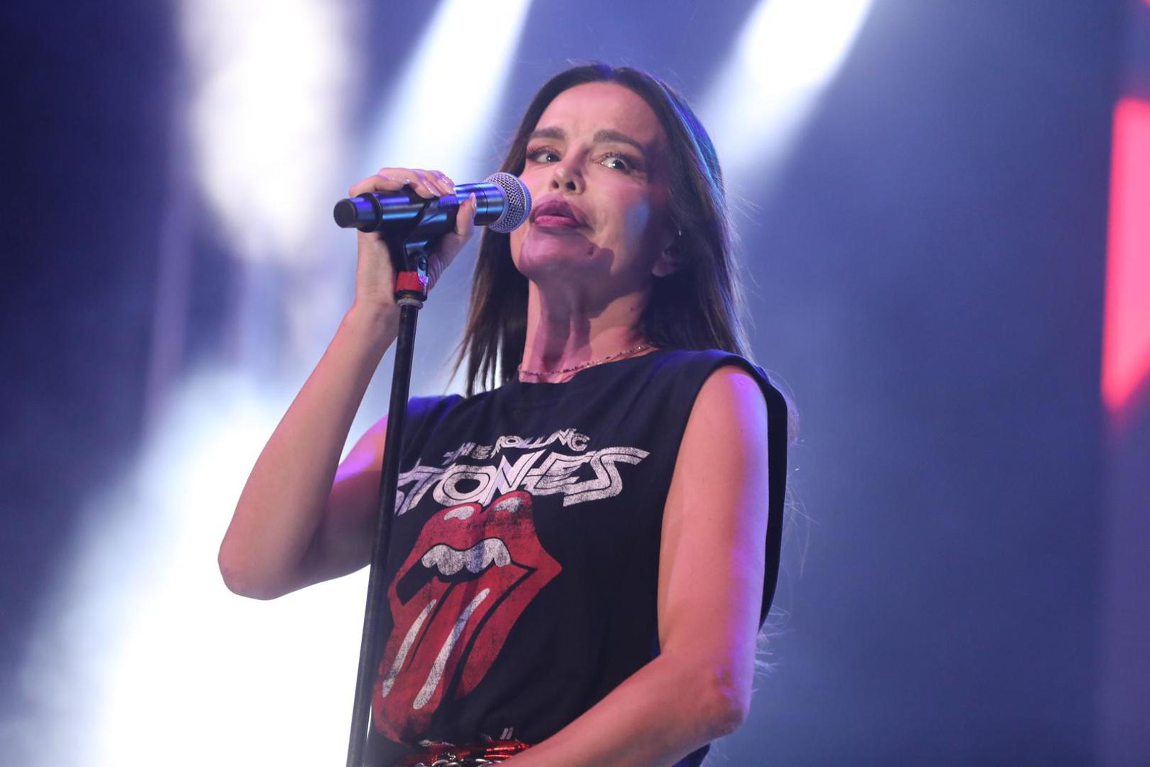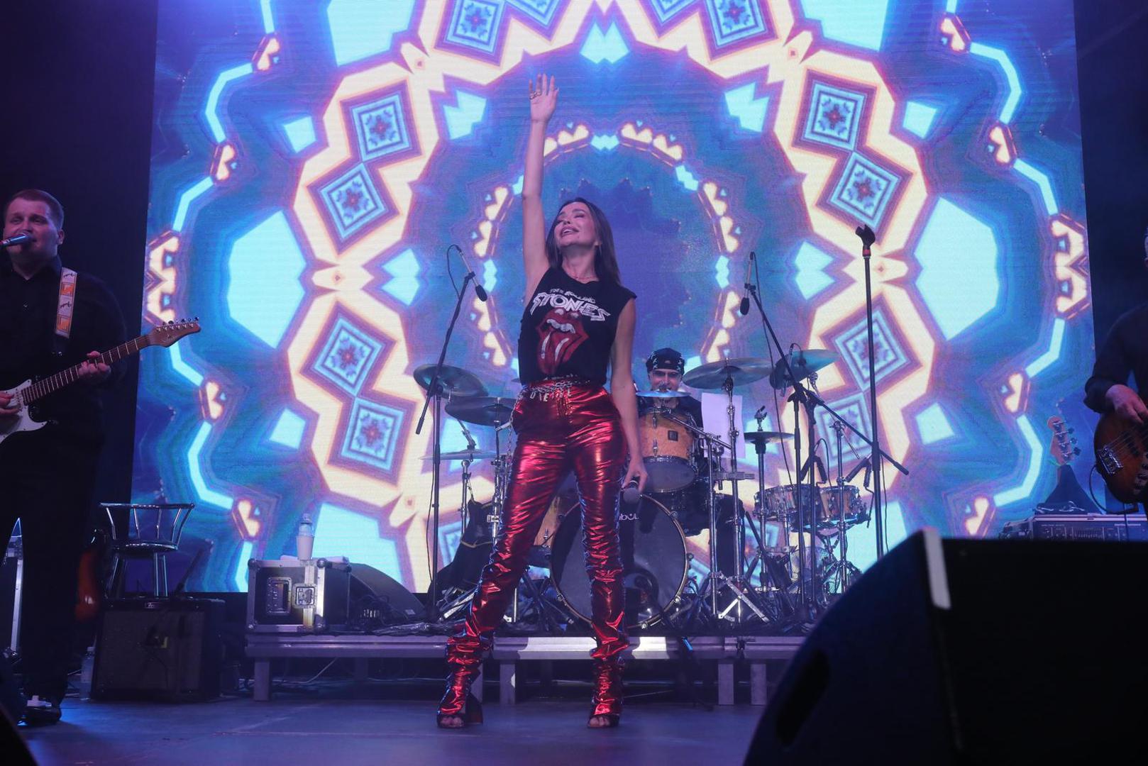 Pjevačica se na pozornici pojavila u rokerskoj modnoj kombinaciji kojom je oduševila. Radilo se o crnoj majici i kožnim, crvenim hlačama preko kojih je nosila remen u obliku lanca, a kosu je raspustila.