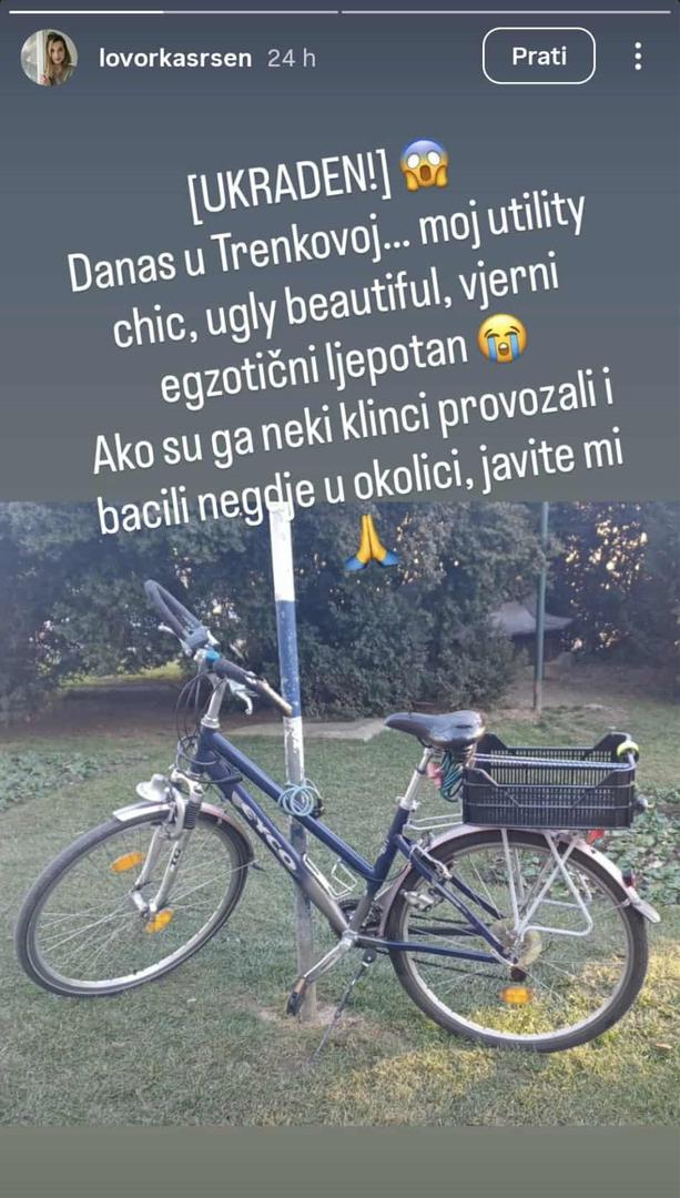 Kantautorica Lovorka Sršen, supruga glumca Janka Popovića Volarića, s kojim čeka prvo zajedničko dijete, doživjela je neugodnost u Zagrebu. Naime, u pričama na Instagramu podijelila je da joj je u Trenkovoj ulici ukraden bicikl. - Ukraden! Danas u Trenkovoj… Moj vjerni egzotični ljepotan. Ako su ga neki klinci provozali i bacili negdje u okolici, javite mi - napisala je trudna glazbenica uz emotikone slomljenog srca i fotografije bicikla, nadajući se pomoći.