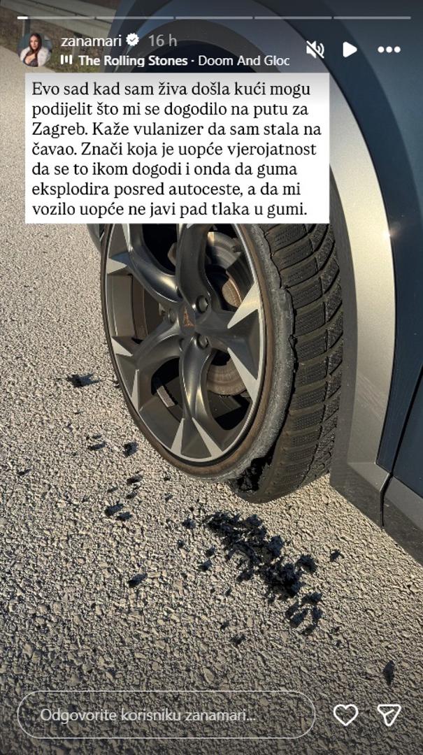 Pjevačica Žanamari Perčić na Isntagramu je opisala kako je na putu za Zagreb doživjela prilično opasnu situaciju. "Evo sad kad sam živa došla kući mogu podijeliti što mi se dogodilo na putu za Zagreb. Kaže vulkanizer da sam stala na čavao. Znači koja je uopće vjerojatnost da se to ikom dogodi i onda da guma eksplodira posred autoceste, a da mi vozilo uopće ne javi pad tlaka u gumi", napisala je pjevačica uz fotografiju puknute gume. Kasnije je objavila i fotografiju iz Makarske. "Lijepo je biti živ i opet piti kavicu pod makarskim suncem. Uživajte u svakom trenutku", napisala je.