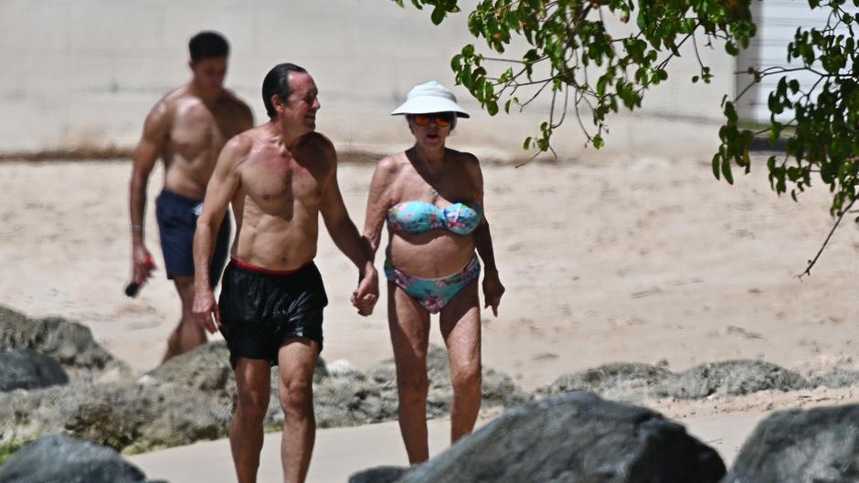 Legendarna glumica Joan Collins najpoznatija po ulozi u seriji 'Dinastija' snimljena je na plaži  s 32 godine mlađim suprugom Percyjem Gibsonom. Nedavno su proslavili 21. godišnjicu braka, a sada su odlučili pobjeći od hladnijih jesenskih temperatura i oluja na Barbados. Tamo su se opustili na plaži. Snimljeni su u kupaćim kostimima te su se držali za ruke. Joan je na sebi imala dvodijelni, šareni badić, dok je Percy odabrao crne bokserice. Collins se štitila od sunca vizirom i naočalama.
