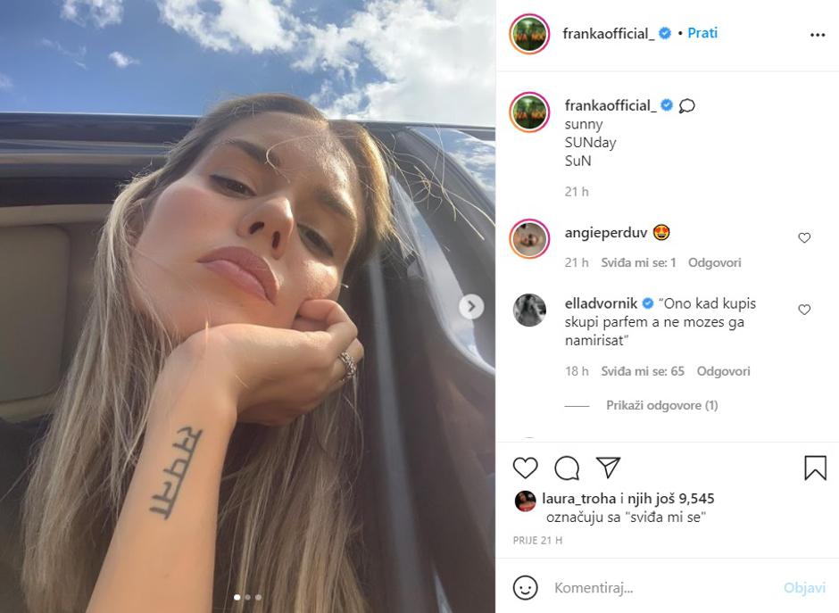Ovog je vikenda objavila kako je izašla prvi put nakon što je zaražena. Dobila je brojne poruke potpore, a javila joj se i Ella Dvornik, koja se našalila s činjenicom da je Franka ostala bez osjeta mirisa i okusa.