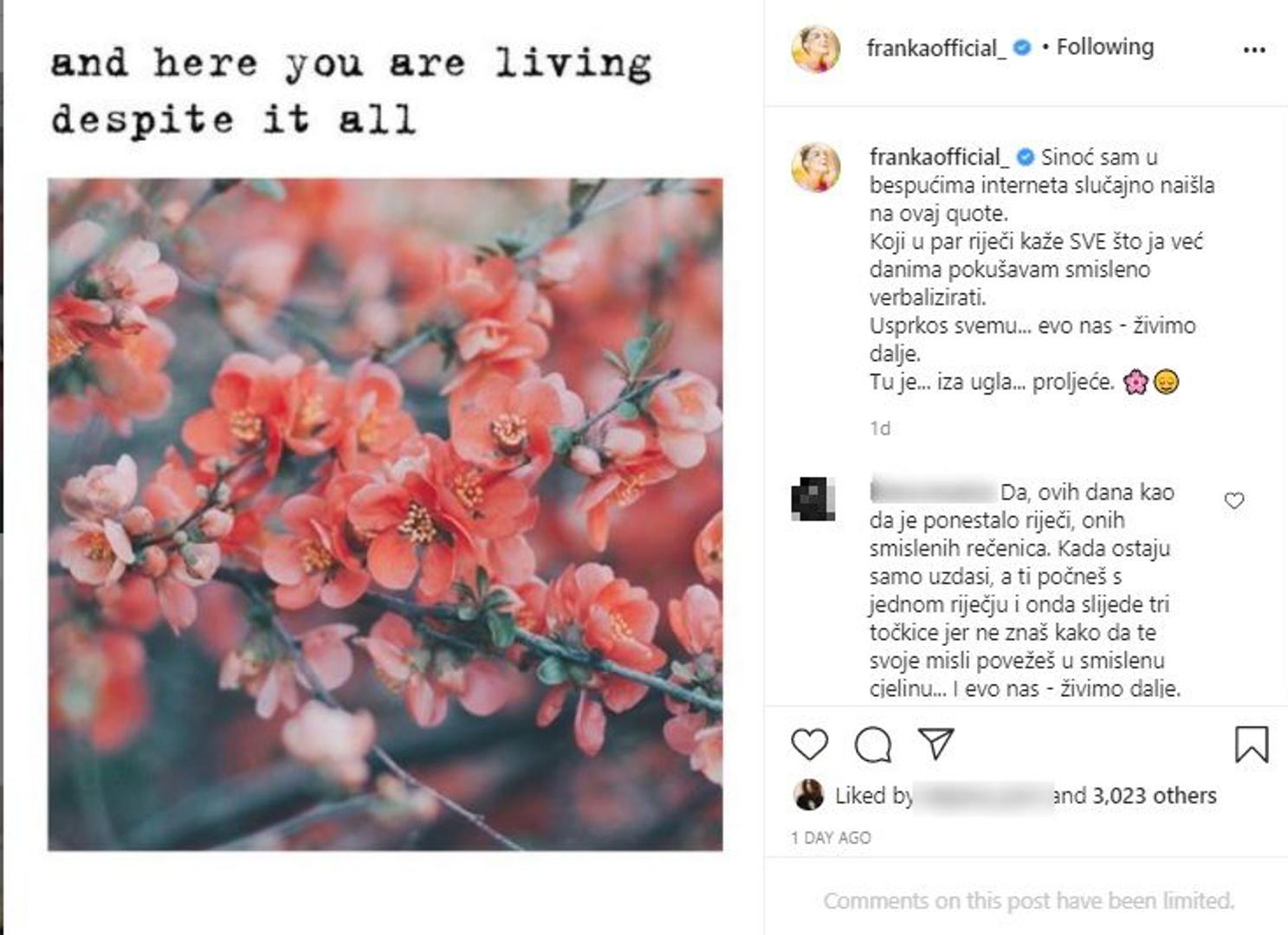 - Sinoć sam u bespućima interneta slučajno naišla na ovaj citat koji u par riječi kaže SVE što ja već danima pokušavam smisleno verbalizirati. "Usprkos svemu, evo nas - živimo dalje". Tu je iza ugla... proljeće, napisala je Franka pokraj fotografije cvijeća.