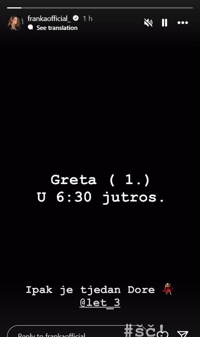 Pjevačica i poduzetnica Franka Batelić (32) i sama je iskusila kako izgleda predstavljanje Hrvatske na Euroviziji, a čini se kako i nakon svog nastupa, i dalje prati ovo natjecanje. Naime, hrvatski izbor za predstavnika na Euroviziji 'Dora 2024.' odvit će se ovaj tjedan, a Franka je pokazala kako se njezina obitelj priprema za njega. Pjevačica se javila s pričom a Instagramu na kojoj je podijelila crnu pozadinu i zvuk na kojem se čuje njezina kćer Greta. Ova snimka mnoge je nasmijala. Franka je snimila svoju kćerkicu Gretu koja se probudila rano ujutro, a ona joj je morala pjevati prošlogodišnji hrvatski hit za Euroviziju ''Mama ŠČ''.
