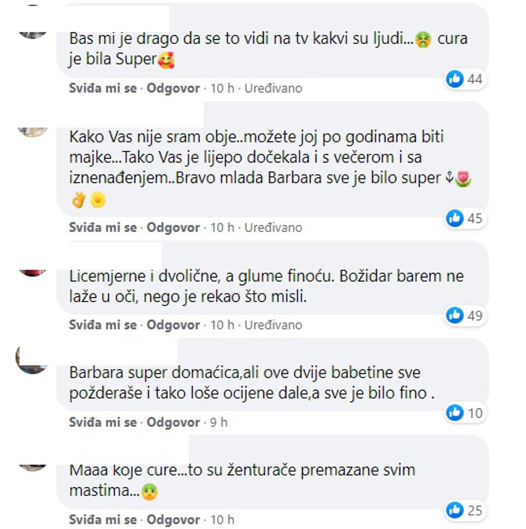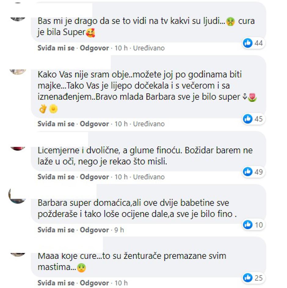 "Svaka čast mladoj curi i na pripremi večere i na sveopćoj kulturi. Više će joj to vrijediti u životu nego ovim dvjema licemjerje zbog pobjede. Mene bi bilo sram moje kćeri da tako bezobrazno podcijenim curu malo stariju od nje", piše u jednom komentaru, dok u drugom stoji: "Kako Vas nije sram obje, možete joj po godinama biti majke...Tako vas je lijepo dočekala i s večerom i sa iznenađenjem... Bravo mlada Barbara, sve je bilo super", poručuju gledatelji.