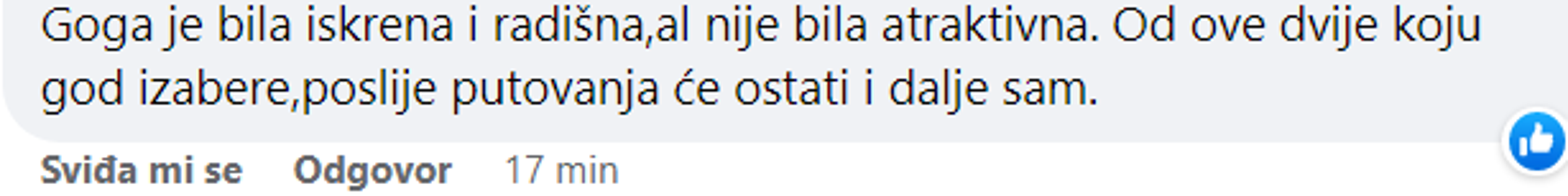 – Goga je bila iskrena i radišna, ali nije bila atraktivna. Od ove dvije koju god izabere, poslije putovanja će ostati i dalje sam – pisali su gledatelji. – Trebao si izabrati Gogu, ne pasti na vanjštinu – savjetovali su mu. – Bolje i sam nego s bilo kim. Mislim da je izbacio onu iskrenu nažalost – istaknula je jedna osoba.