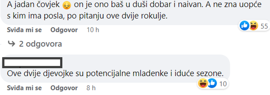 – Ove dvije djevojke su potencijalne mladenke i iduće sezone – komentirali su. – A jadan čovjek. On je ono baš u duši dobar i naivan, a ne zna uopće s kim ima posla – pisali su gledatelji.