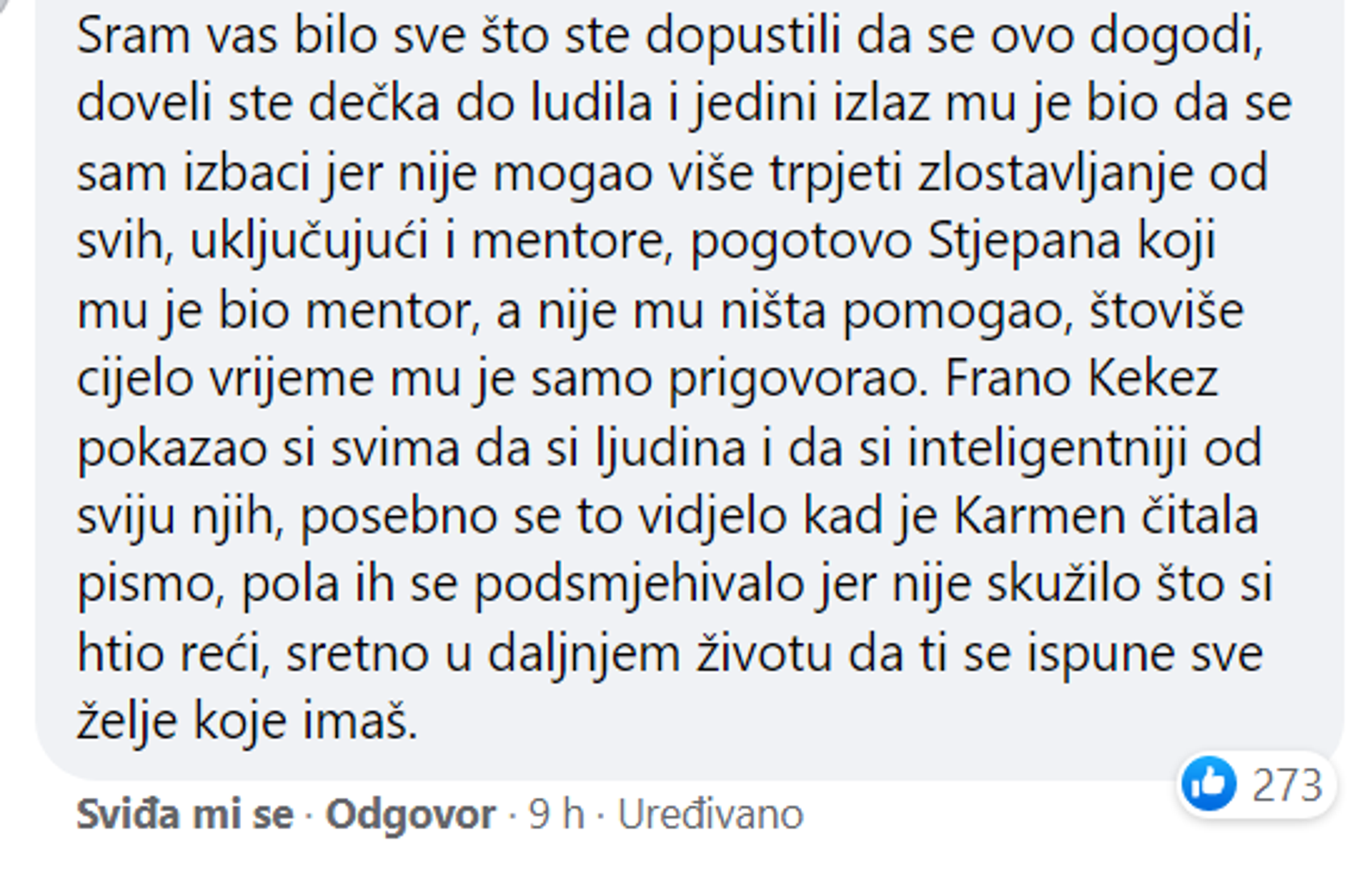 „Jedino što je valjalo je sebe sabotiralo, a mentor to nije mentor. To nije ni m od mentora, jer kako su ovi Franu šikanirali tako je i mentor. Što je ovo došlo, bitno se povesti za masom. Frano ljudino svaka čast, kapa do poda“, složila se druga osoba, a gledatelji su dodali i da se radi o 'sramoti od Masterchefa'. „Ovo više nije za gledati. Toliko pokvarenih, dvoličnih, zločestih, a mladih ljudi da nije istina. Svaka čast Frani. Izbacili su ga međuljudski odnosi“, napisala je još jedna osoba te dodala da se veseli da iz emisije izbace Gogu.