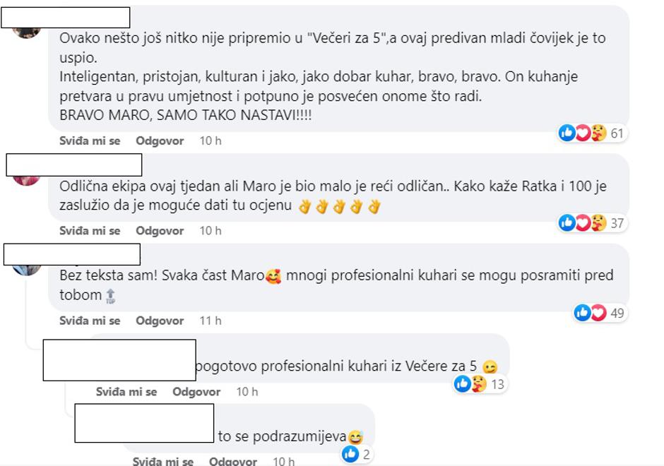 Inteligentan, pristojan, kulturan i jako, jako dobar kuhar, bravo, bravo. On kuhanje pretvara u pravu umjetnost i potpuno je posvećen onome što radi. BRAVO MARO, SAMO TAKO NASTAVI!!!!", "Bez teksta sam, mnogi profesionalni kuhari se mogu posramiti pred tobom" hvalili su ga u komentarima.
