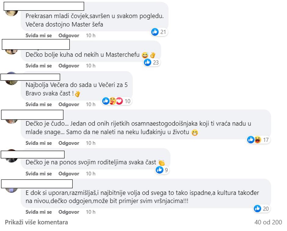 "Prekrasan mladi čovjek,savršen u svakom pogledu. Večera dostojna Masterchefa", "Najbolja večera do sad u Večeri za 5. Bravo, svaka čast!", "Dečko je čudo, jedan od onih rijetkih osamnaestogodišnjaka koji ti vraća nadu u mlade snage", "Na ponos svojim roditeljima", "Primjer vršnjacima", samo su neki od komentara Facebook stranici showa Večera za 5 na selu.
