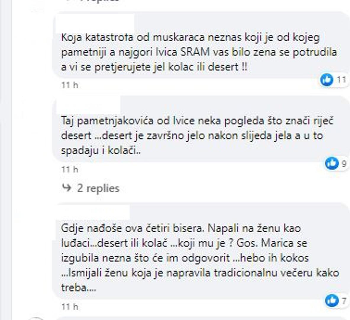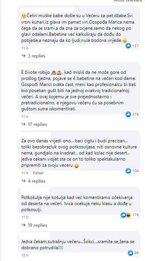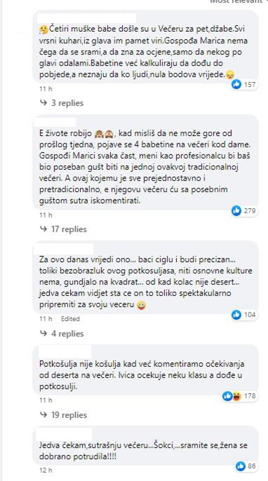 "Četiri muške babe došle su u Večeru za pet, džabe. Svi vrsni kuhari,iz glava im pamet viri. Gospoda Marica nema čega da se srami,a da zna za ocjene samo da nekog po glavi odalami. Babetine već kalkuliraju da dođu do pobjede, a ne znaju da kao ljudi ,nula bodova vrijede", "E živote robijo. A kad misliš da ne može gore od prošlog tjedna, pojave se četiri babetine na večeri kod dame. Gospođi Marici svaka čast, meni kao profesionalcu bi baš bio poseban gušt biti na jednoj ovakvoj tradicionalnoj večeri. A ovaj kojemu je sve prejednostavno i pretradicionalno, e njegovu večeru ću s posebnim guštom sutra iskomentirati", "Za ovo danas vrijedi ono... baci ciglu i budi precizan... toliki bezobrazluk ovog potkošuljaša, niti osnovne kulture nema, gunđalo na kvadrat... od kad kolac nije desert... jedva čekam vidjet što će on to toliko spektakularno pripremiti za svoju večeru", "Potkošulja nije košulja kad već komentiramo očekivanja od deserta na večeri. Ivica očekuje neku klasu a dođe u potkošulji", "Jedva čekam,sutrašnju večeru... Šokci,...sramite se, žena se dobrano potrudila!!!!", "Koja katastrofa od muškaraca ne znaš koji je od kojeg pametniji, a najgori Ivica SRAM vas bilo zena se potrudila a vi se pretjerujete je l' kolač ili desert !!", "Taj pametnjakovića od Ivice neka pogleda što znači riječ desert...desert je završno jelo nakon slijeda jela a u to spadaju i kolači..", "Gdje nađoše ova četiri bisera. Napali na ženu kao luđaci...desert ili kolač ...koji mu je ? Gos. Marica se izgubila ne zna što će im odgovorit...**ebo ih kokos ...ismijavali su ženu koja je napravila tradicionalnu večeru kako treba...." samo su neki od komentara.