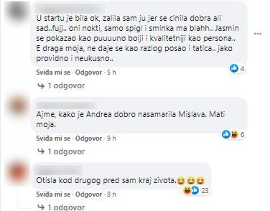 "U startu je bila ok, žalila sam je jer se činila dobra, ali sad... fuj... oni nokti, samo špigl i šminka, ma blahh... Jasmin se pokazao kao puuuuno bolji i kvalitetniji kao persona... E. draga moja, ne daje se kao razlog posao i tatica... jako providno i neukusno...", "Ukoliko joj scenarijem nije određena uloga, onda je stvarno jadna. Tipka se s njim, popila kavu i on je čovjek njenog života", složili su se brojni u komentarima.