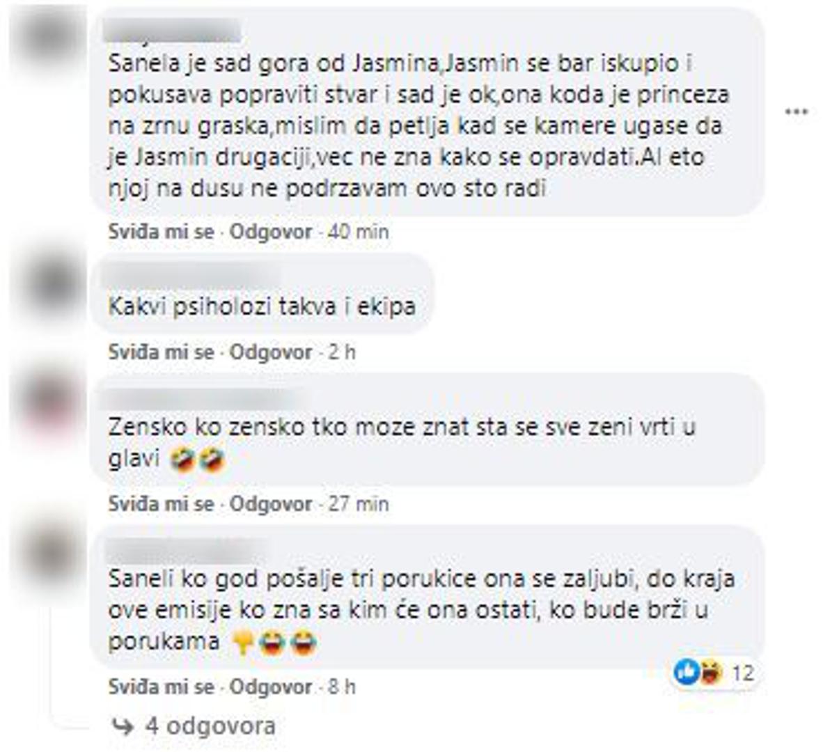 "Sanela je sad gora od Jasmina, Jasmin se bar iskupio i pokušava popraviti stvar i sad je ok, ona ko da je princeza na zrnu graška, mislim da petlja kad se kamere ugase da je Jasmin drugačiji, već ne zna kako se opravdati. Al, eto, njoj na dušu ne podržavam ovo sto radi", "Saneli ko god pošalje tri porukice ona se zaljubi, do kraja ove emisije ko zna s kim će ona ostati, ko bude brži u porukama", pisali su gledatelji.