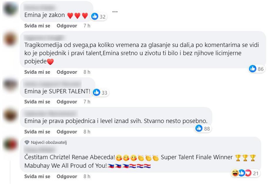 "Emina je prava pobjednica!!!!! Pjevači i pjevačice neka se jave u Voice i tamo se dokažu!", "Malena ima glas i jako simpatična, ali Emina je trebala pobijediti, to je za mene supertalent", "Emina je za mene pobjednica Supertalenta", "Emina je zakon", "Tragikomedija od svega, pa koliko vremena za glasanje su dali, a po komentarima se vidi tko je pobjednik i pravi talent, Emina sretno u životu ti bilo i bez njihove licimjerne pobjede", "Emina je prava pobjednica i level iznad svih. Stvarno nešto posebno", "Nema ništa protiv djevojčice, ali mislim da je Emina trebala pobjediti. Jedina je zaista imala SUPERTALENT", brojni su pisali u komentarima.