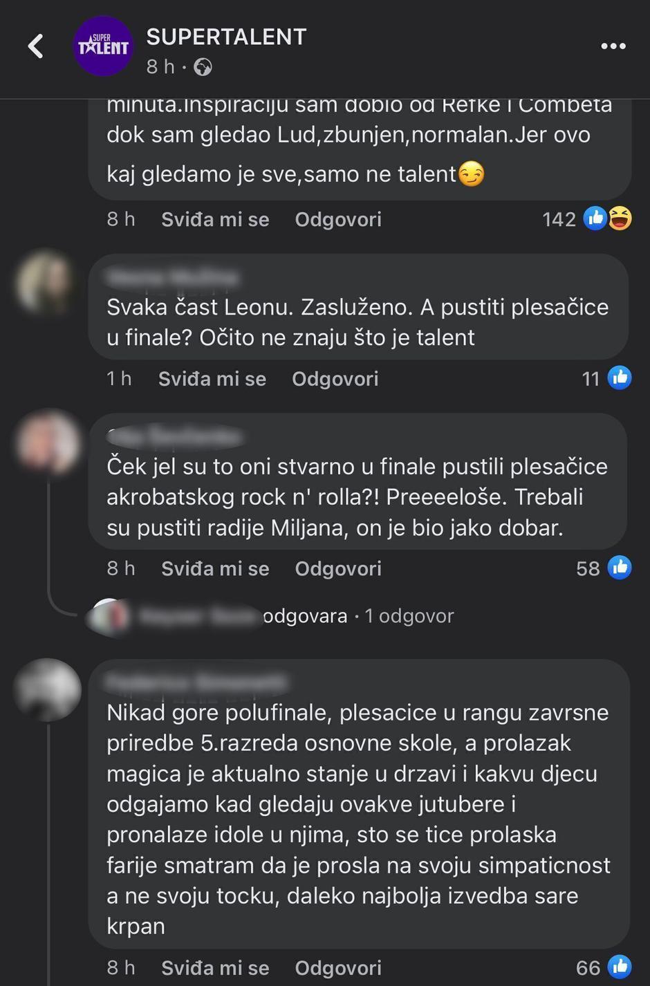 ''Jedino je Leon zaslužio'', ''Svaka čast Leonu. Zasluženo. A pustiti plesačice u finale? Očito ne znaju što je talent'', ''A Sara, cura je super talent i ne prođe. Žalosno'', ''Bez veze mi je što smatraju talentom te plesne skupine, jer to može uvježbati svako tko ima ritma u sebi i koga vježba trener, to je za mene vježba i trud, a ne talent'', ''Odu talenti doma'', ''Od finalista jedino je Leon talent'', ''Ovo s grupama mi nema smisla. Bez veze'', ''Sara Krpan jedini istinski talent! Sramotno što nije prošla'', ''Dva zlatna gumba, očekivano i predvidljivo, ali i nezasluženo....a ove plesačice, stvarno nevjerojatno da su uopće bile u polufinalu, sramota...'', samo je dio komentara.