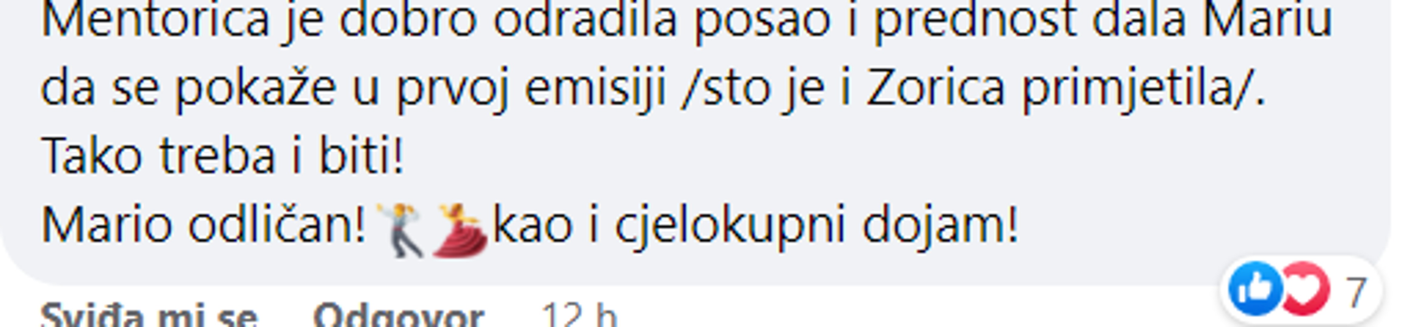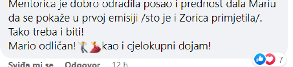 Komentari na nastup redatelja Marija Kovača i pjevačice Lu Jakelić bili su pozitivni. „Mentorica je dobro odradila posao i prednost dala Mariju da se pokaže u prvoj emisiji (što je i Zorica primijetila). Tako treba i biti! Mario odličan, kao i cjelokupni dojam!“, pisali su.