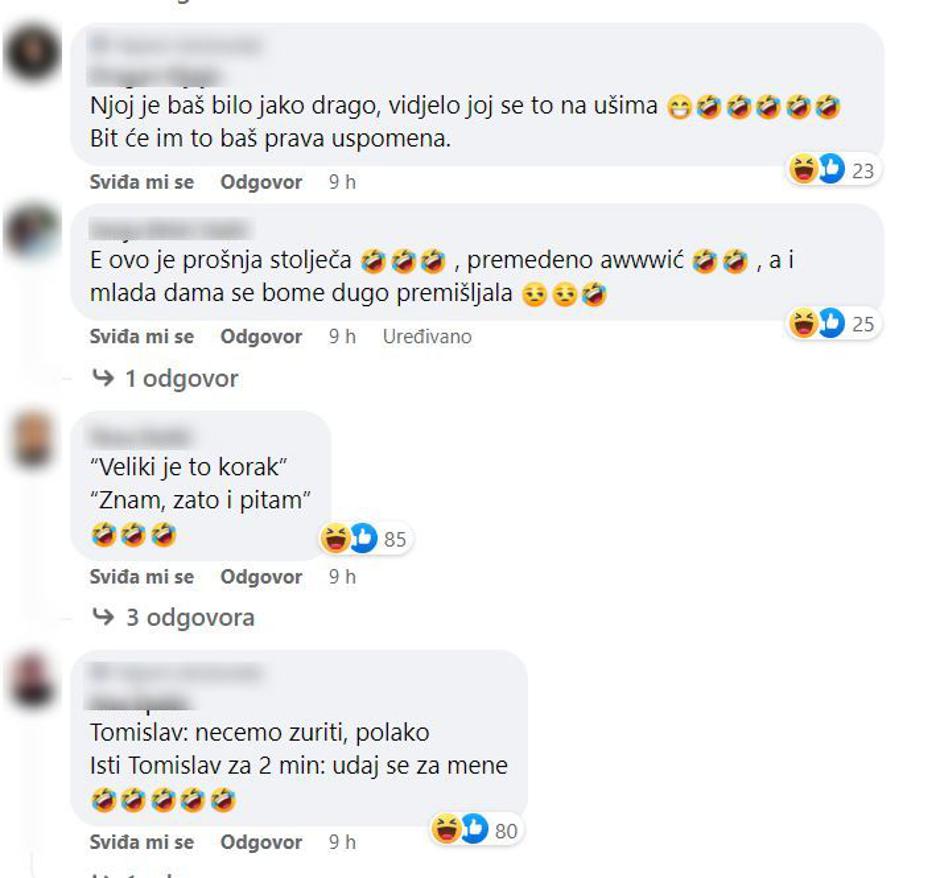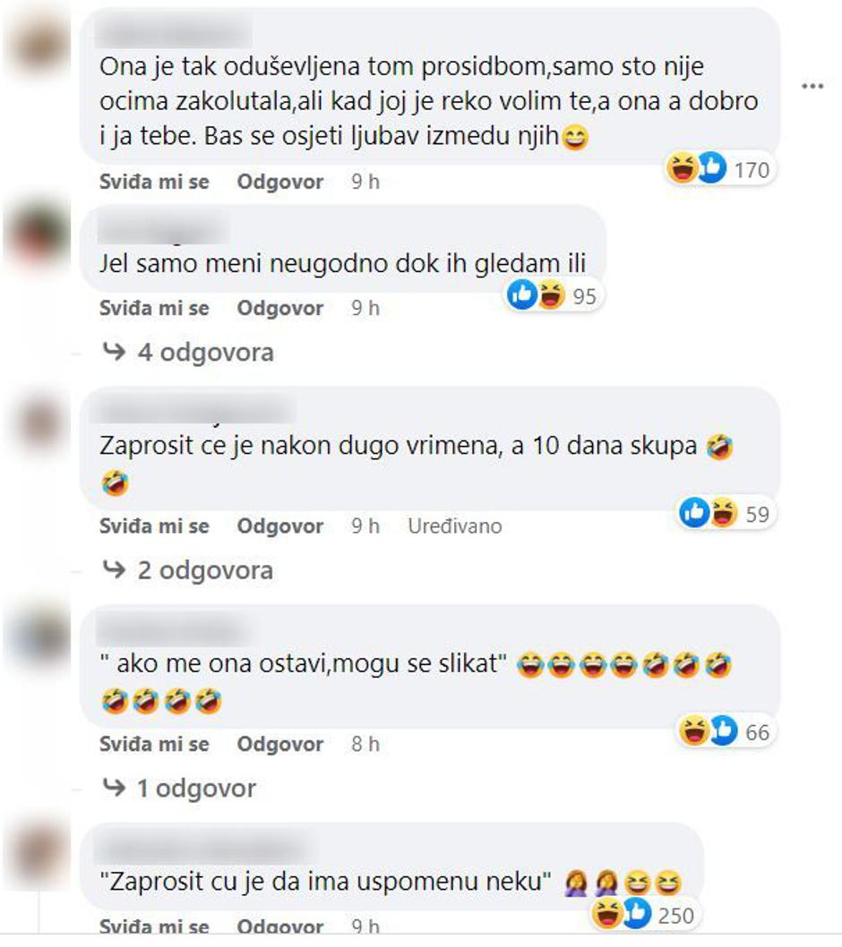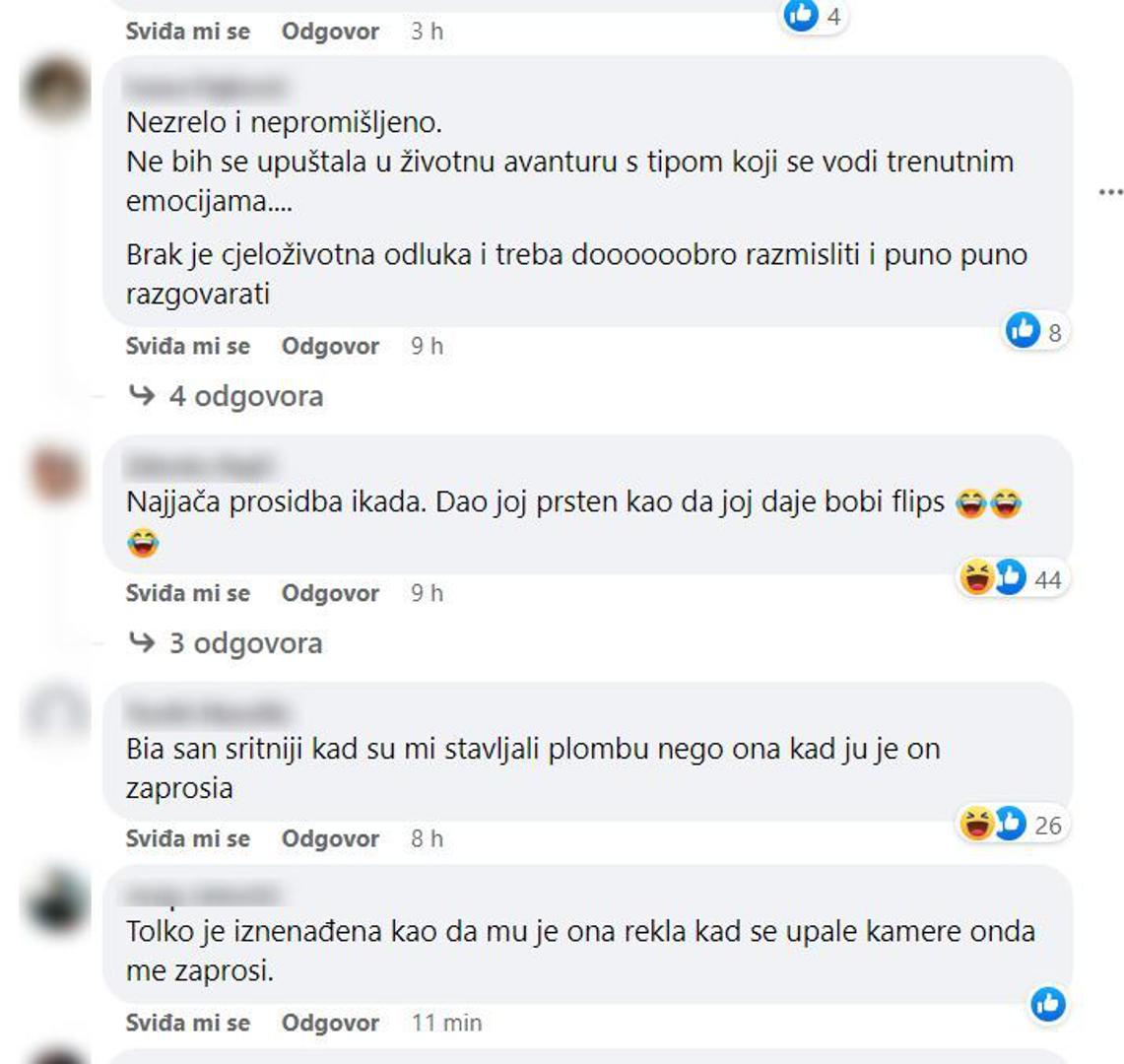 "Najjača prosidba ikada. Dao joj prsten kao da joj daje Bobi flips", "Nezrelo i nepromišljeno. Ne bih se upuštala u životnu avanturu s tipom koji se vodi trenutnim emocijama... Brak je cjeloživotna odluka i treba dobro razmisliti i puno, puno razgovarati", "Kaže ona dugo mu je trebalo! Kao da su godinama skupa", "Kaže idemo korak po korak, polako. A onda nakon dvi minute preskoči sve korake hahaha", "Gukni golube.. mislim da romantičniju prosidbu u životu, ovoj jedinom, mom, nisam vidjela. Oni, šokirana sam i sve to ostalo...", "Ona je tako oduševljena tom prosidbom, samo što nije očima zakolutala, ali kad joj je rekao volim te, a ona a dobro i ja tebe. Baš se osjeti ljubav između njih", pisali su pomalo iznenađeni gledatelji.