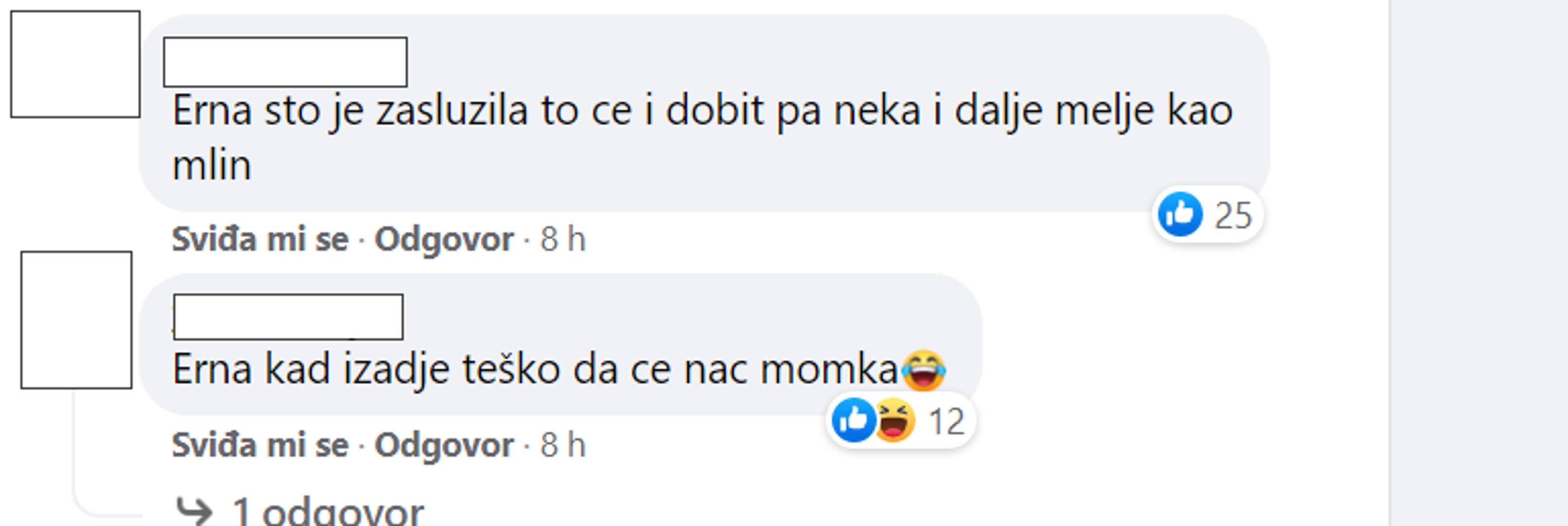 Gledatelji su komentirali i Ernino ponašanje. „Erna što je zaslužila to će i dobiti pa neka i dalje melje kao mlin“, komentirali su, a dodali su i da će 'sutra biti show'. „Erna kad izađe, teško da će naći momka“, komentar je još jedne osobe.