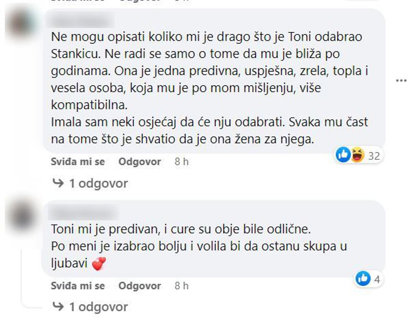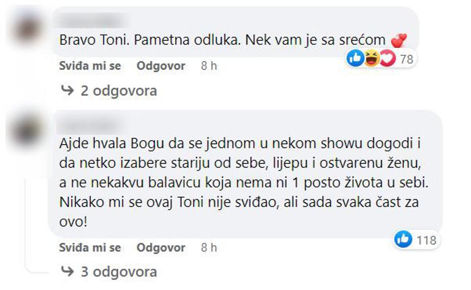 "Bravo Toni. Pametna odluka. Nek vam je sa srećom", "Ajde hvala Bogu da se jednom u nekom showu dogodi i da netko izabere stariju od sebe, lijepu i ostvarenu ženu, a ne nekakvu balavicu koja nema ni 1 posto života u sebi. Nikako mi se ovaj Toni nije sviđao, ali sada svaka čast za ovo!", "Meni se Stankica dopala od prvog dana, pa sretno", "Ne mogu opisati koliko mi je drago što je Toni odabrao Stankicu. Ne radi se samo o tome da mu je bliža po godinama. Ona je jedna predivna, uspješna, zrela, topla i vesela osoba, koja mu je po mom mišljenju, više kompatibilna. Imala sam neki osjećaj da će nju odabrati. Svaka mu čast na tome što je shvatio da je ona žena za njega", pisali su oni koji su sretni zbog odabira.