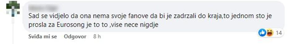 "Sad se vidjelo da ona nema svoje fanove da bi je zadržali do kraja, to jednom što je prošla za Eurosong, to je to. Više neće nigdje", napisao je jedan korisnik Facebooka.