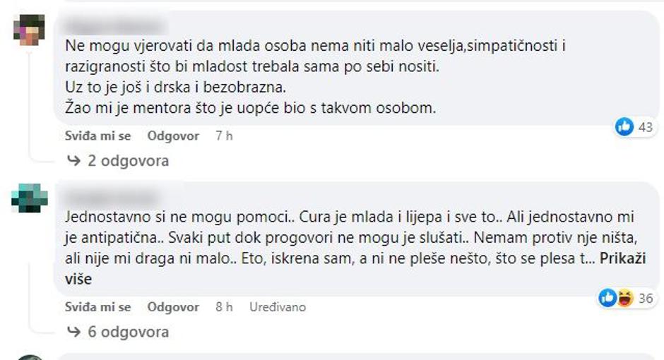 "Ne mogu vjerovati da mlada osoba nema niti malo veselja, simpatičnosti i razigranosti, što bi mladost trebala sama po sebi nositi. Uz to je još i drska i bezobrazna. Žao mi je mentora što je uopće bio s takvom osobom", oštra je bila jedna gledateljica.