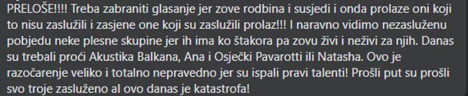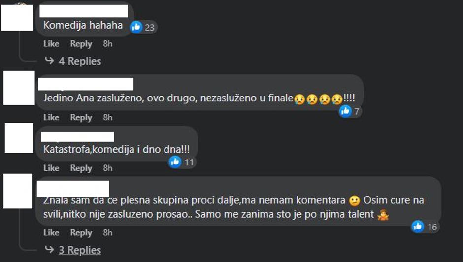 "PRELOŠE!!!! Treba zabraniti glasanje jer zove rodbina i susjedi i onda prolaze oni koji to nisu zaslužili i zasjene one koji su zaslužili prolaz!!! I naravno vidimo nezasluženu pobjedu neke plesne skupine jer ih ima kao štakora pa zovu živi i neživi za njih. Danas su trebali proći Akustika Balkana, Ana i Osječki Pavarotti ili Natasha. Ovo je razočarenje veliko i totalno nepravedno jer su ispali pravi talenti! Prošli put su prošli svo troje zasluženo al ovo danas je katastrofa!", "Komedija hahaha", "Jedino Ana zasluženo, ovo drugo, nezasluženo u finale!!!!", "Katastrofa,komedija i dno dna!!!", "Znala sam da će plesna skupina proći dalje, ma nemam komentara Osim cure na svili,nitko nije zasluženo prošao.. Samo me zanima sto je po njima talent", "Ovo je grozno što izabrali večeras", "Nisu ušli u finale oni koji su trebali, "Katastrofa...osim cure na svili...", "Katastrofa...e kad misliš da ne može" samo su neki od komentara ogorčenih gledatelja. Mnogi su ipak zaključili da je Ana Vukman zasluženo prošla.