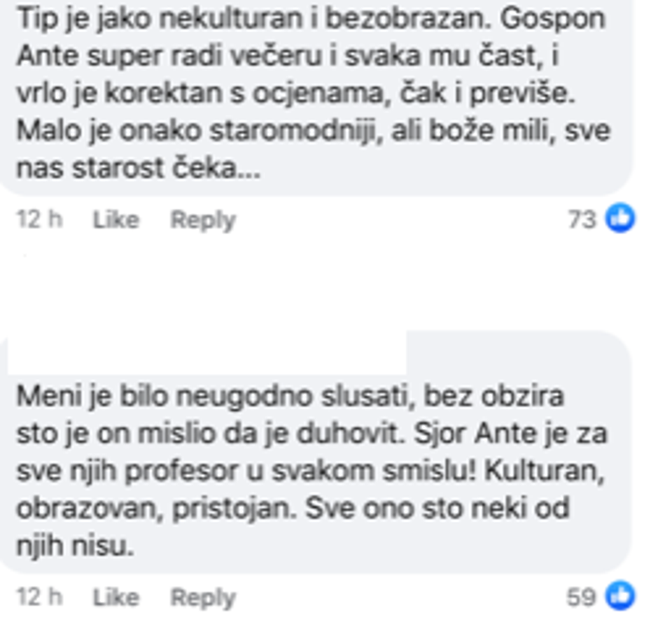 "Tip je jako nekulturan i bezobrazan. Gospon Ante super radi večeru i svaka mu čast i vrlo je korektan s ocjenama, čak i previše. Malo je onak' staromodniji, ali Bože mili, sve nas starost čeka..."