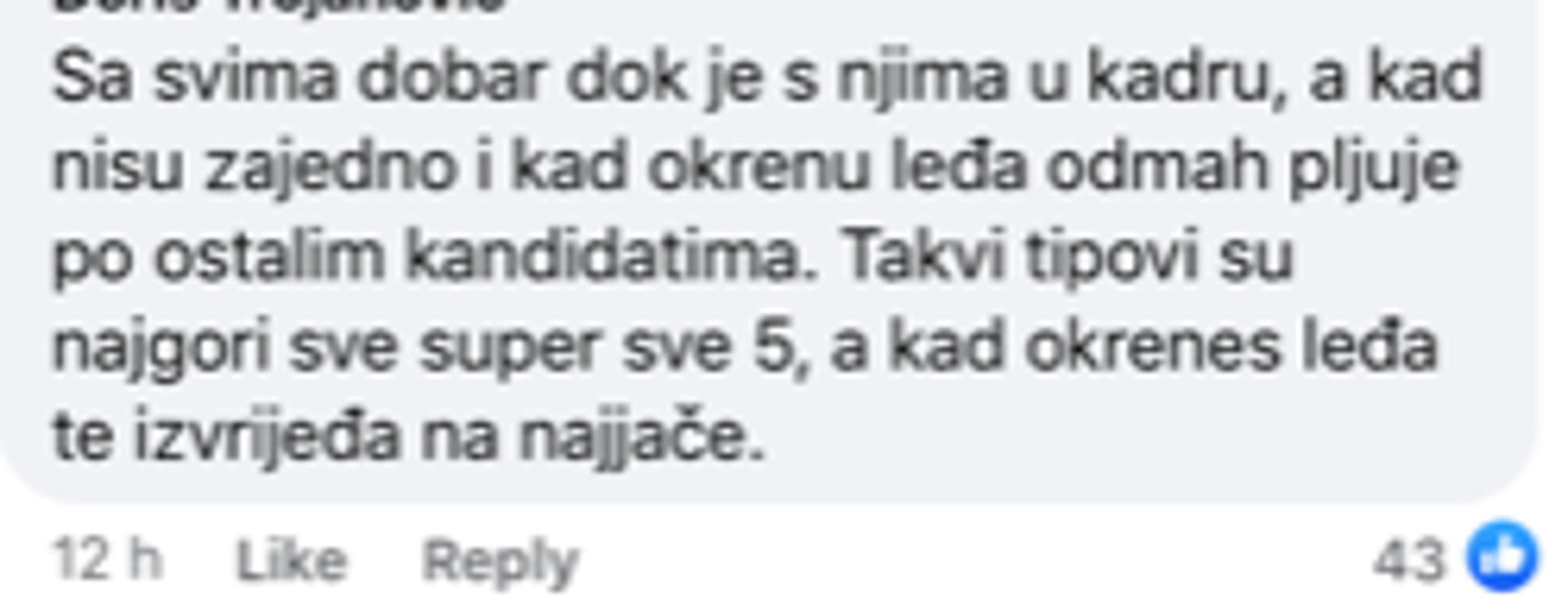 "Sa svima dok je s njima u kadru, a kad nisu zajedno i kad okrenu leđa, odmah pljuje po ostalim kandidatima. Takvi tipovi su najgori. Sve super, sve pet, a kad okreneš leđa, izvrijeđa te na najjače."