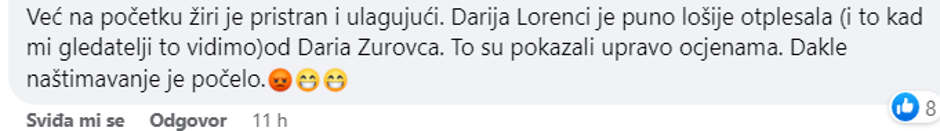 - Već na početku žiri je pristran i ulagujući. Darija Lorenci je puno lošije otplesala (i to kad mi gledatelji to vidimo) od Darija Zurovca. To su pokazali upravo ocjenama. Dakle naštimavanje je počelo – napisala je jedna gledateljica.