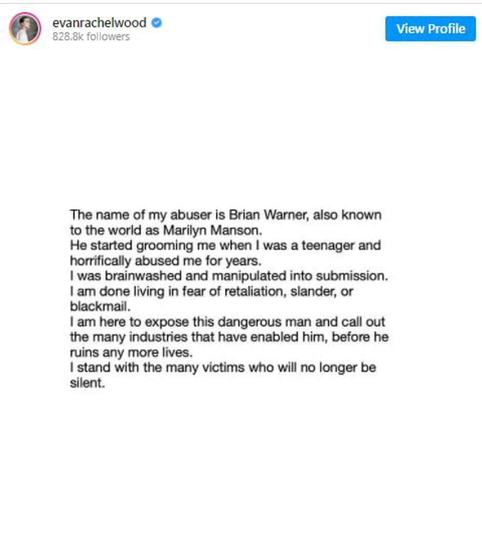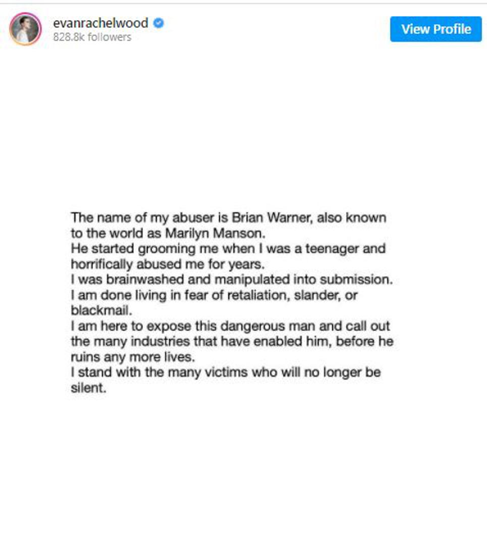 "Ime mojeg zlostavljača je Brian Warner, koji je svijetu poznat kao Marilyn Manson. Počeo me 'pripremati' kad sam bila tinejdžerica. Stravično me zlostavljao godinama. Isprao mi je mozak i izmanipulirao me da mu budem podčinjena. Ne želim više živjeti u strahu od odmazde, klevete ili ucjene", napisala je glumica.