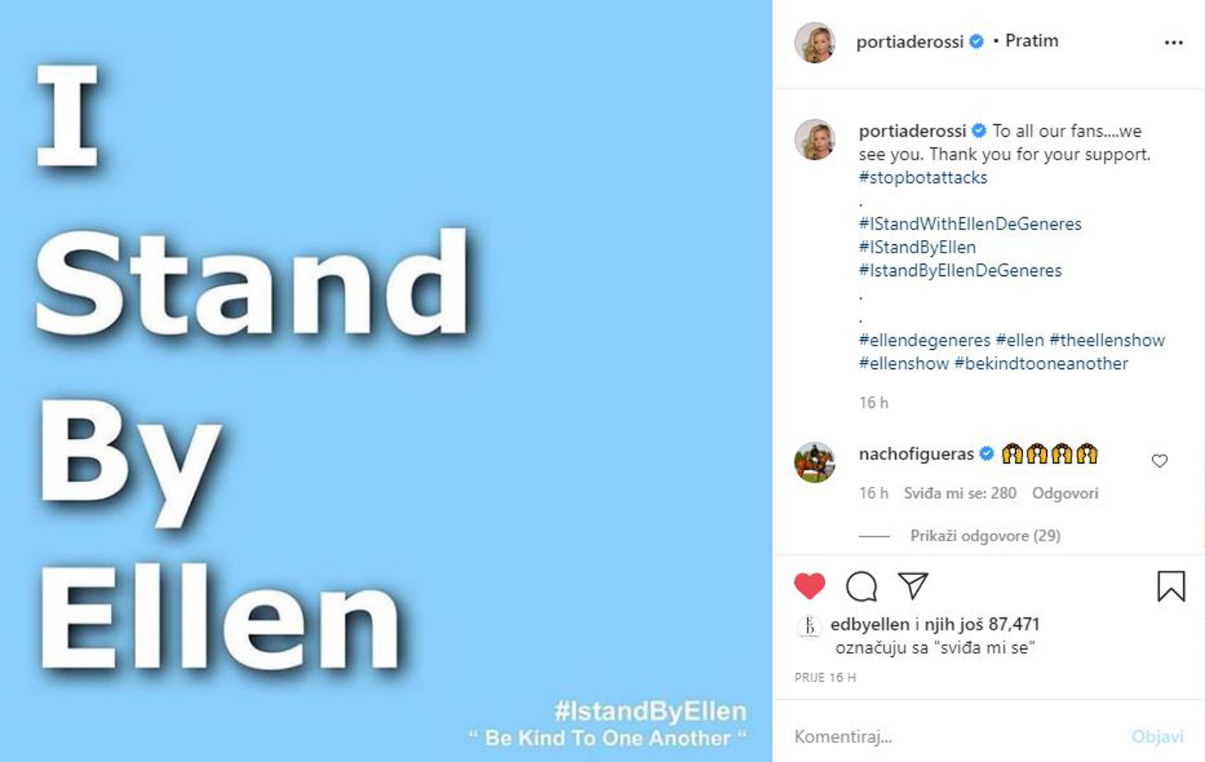 Portia je sada na Instagramu objavila footgrafiju na kojoj piše "Stojim uz Ellen", a u opisu je napisala: "Svim našim obožavateljima... Vidimo vas. Hvala vam na podršci" i dodala hashtagove #IStandWithEllenDeGeneres, #IStandByEllen i #IStandByEllenDeGeneres. Mnogi su već sada slijedili njezin primjer i dijelili hashtagove.