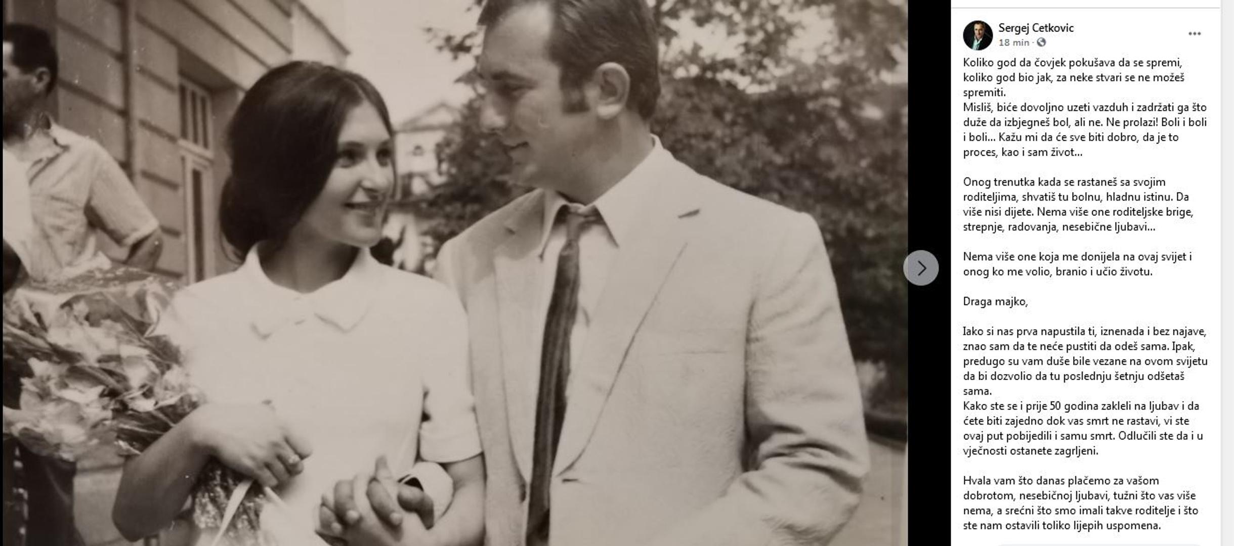 "Onog trenutka kada se rastaneš sa svojim roditeljima, shvatiš tu bolnu, hladnu istinu. Da više nisi dijete. Nema više one roditeljske brige, strepnje, radovanja, nesebične ljubavi... Nema više one koja me donijela na ovaj svijet i onog ko me volio, branio i učio životu", poručio je Sergej Ćetković.
