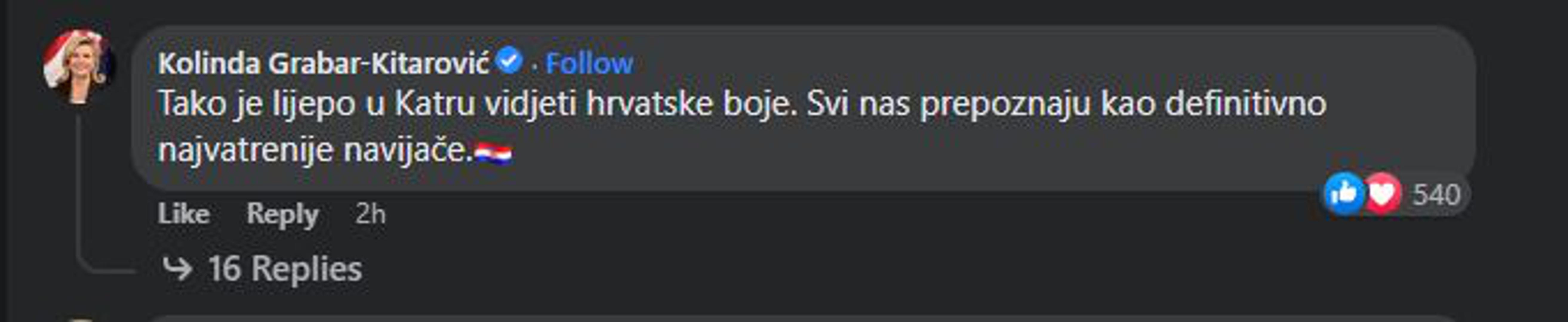 Musić Milanović odlučila se za cijeli crveni outfit pa je tako obukla crveno odijelo, a privlačila je pažnju i crvenim šeširićem na glavi. Nakon utakmice, Milanović je objavio selfie sa suprugom na svom Facebook profilu, a tek sada je to uočila bivša predsjednica Kolinda Grabar-Kitarović koja mu se odlučila javiti u komentarima.